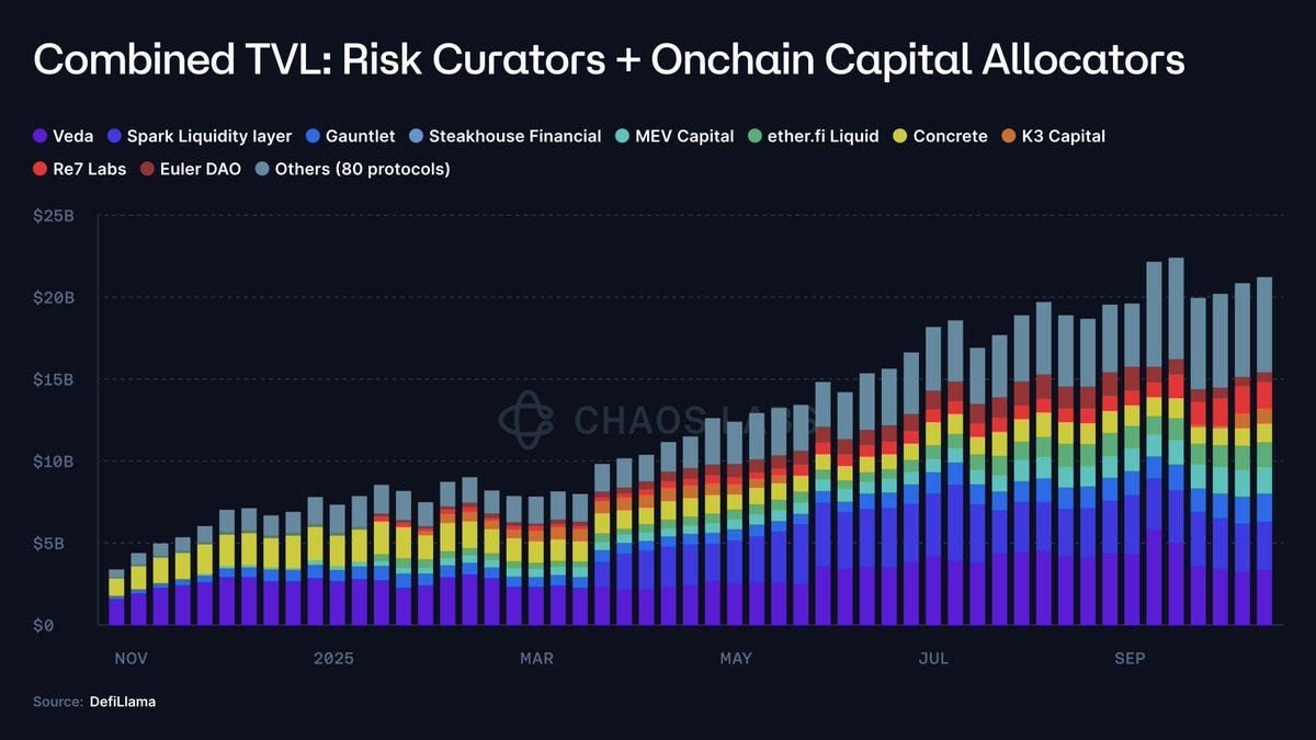 Chaos Labs:DeFi 已进入一个全新阶段 —— 结构化与专业化的时代。机构交易策略正在被抽象为可组合、可代币化的链上资产。从最初的流动质押代币(LST)开始,到 Ethena Labs 推出的代币化基差交易成为关键转折点,标志着结构化收益产品的崛起。Ethena 通过将中性对冲策略封装为合成美元(USDe),把原本需要 24 小时管理保证金的复杂操作简化为一键参与,彻底重塑了用户对 DeFi 的预期。过去只属于机构交易台的收益策略,如今被大众化、可流通化。USDe 也成为史上最快达到 100 亿美元 TVL 的稳定币。Ethena 的成功显示出市场对机构级策略代币化访问的深层需求,由此催生出一批新的角色,风险策展人(Risk Curators)或链上资本配置者(OCCAs)。它们将收益与风险重新打包,通过模块化资金市场(如 Morpho、Euler)或品牌策略金库,为用户提供更简洁、可访问的投资入口。OCCAs 的 TVL 从 2023 年的 200 万美元飙升至 200 亿美元,增长 1 万倍。这种演进推动了一个关键问题:这些资金究竟被部署到哪里?风险是否透明?以及在市场波动或挤兑中,系统能否保持稳定?