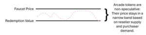 Arcade Token 的关键在于其供需机制。与可投机的网络代币不同,它们并不赋予持有人所有权,而是提供访问应用的权限。其市场价值被设计为通过“价格天花板+价格地板”机制保持稳定。例如在街机厅的类比中:代币售卖机(faucet)会永远以固定价格(如 0.25 美元)出售代币,形成价格天花板;而当商家以略低价格(如 0.20 美元)回购时,则形成价格地板。这样,当用户可以随时以 0.25 美元购买代币时,不会有人用 1 美元的价格从投机者手中购买。即便有人离开生态时想以折扣抛售,也不太可能让代币突破设定的价格区间。这种价格区间设计让代币具备稳定的消费价值,从而特别适合作为「可控市场经济」的基础货币。相比之下,稳定币虽然也追求价值稳定,但它不能满足 Arcade Token 的核心功能:发行方无法自由铸造稳定币用于激励,也无法通过定制化规则(如可转移性限制、过期机制、专用兑换场景等)来控制经济行为。此外,Arcade Token 可让生态内部的价值循环更加紧密,例如商家可以按需铸造代币用于补贴用户,通过代币激励开发者、合作伙伴或高价值行为,从而加速冷启动并建立更强的网络效应。因此,Arcade Token 与其说是“支付工具”,不如说是「可编程的内部经济调控系统」,其核心目的不是稳定价值本身,而是通过灵活的发行与兑换机制,实现增长、激励与经济管理。