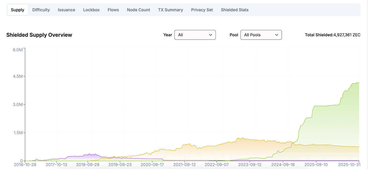 隐私币的最新热度离不开名人和机构的共振。ZEC 的飙升始于硅谷投资人 Naval 于 10 月 1 日转发 Helius 创始人 mert 的言论:「比特币是法币的保险,Zcash 是比特币的保险。」彼时 ZEC 仅 68 美元。20 日,Naval 再度发声,强调 Zcash 的「透明选项」设计是其能长期保留在交易所的重要原因,并指出随着去中心化交易所兴起,这一顾虑将被淡化。这番言论无异于点燃市场情绪,隐私币集体上扬。此外,灰度基金持有逾 1 亿美元 ZEC 信托资产,加之 Coinbase 等平台的交易活跃,使隐私币板块重新获得流动性与机构背书。技术层面上,ZEC 开发方 Electric Coin Co. 发布了 2025 Q4 路线图,计划通过优化 Zashi 钱包、引入 NEAR Intents 协议与 P2SH 多签功能提升隐私体验。Zcash 的隐私池代币总量已突破 492 万枚,占流通量 30%,显示其真实使用率显著上升。
