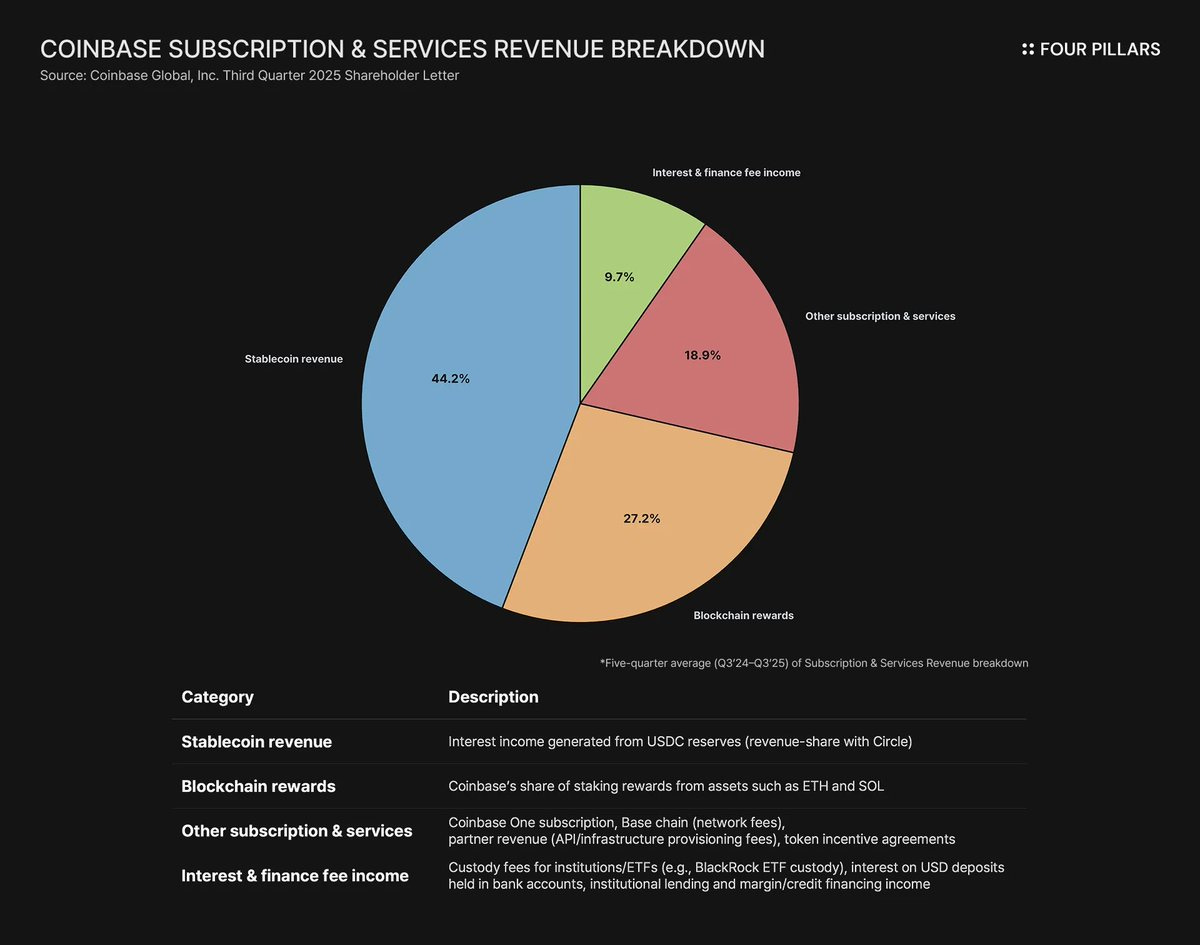 Four Pillars:随着稳定币、代币化证券以及新型加密银行逐渐替代传统金融基础设施,中心化交易所(CEX)正在成为加密金融体系转型的关键枢纽。Coinbase 近年通过收购 Echo、Deribit 与 Liquifi 等平台,加速扩张其业务范围,展现出交易所正从单一撮合交易角色,迈向多业务综合金融平台的发展趋势。核心变化在于:未来的增长点不再依赖交易手续费,而是来自会员订阅、托管服务、支付业务、收益产品等非交易收入模型。原因很简单:现货与衍生品交易已早早步入成熟周期,增量有限,却受市场情绪影响强烈,呈高度周期性波动。而 CEX 在监管许可、机构托管能力、跨链兼容性、用户触达、以及合规入金等方面具有天然优势,使其成为最具规模化推动力的加密金融基础设施提供者。随着用户金融行为逐步迁移链上,CEX 正在演变为类似金融 App 超级入口的角色,把资产托管、支付、收益、投资与 DeFi 工具整合为单一产品体验,进一步强化其平台依赖与网络效应。
