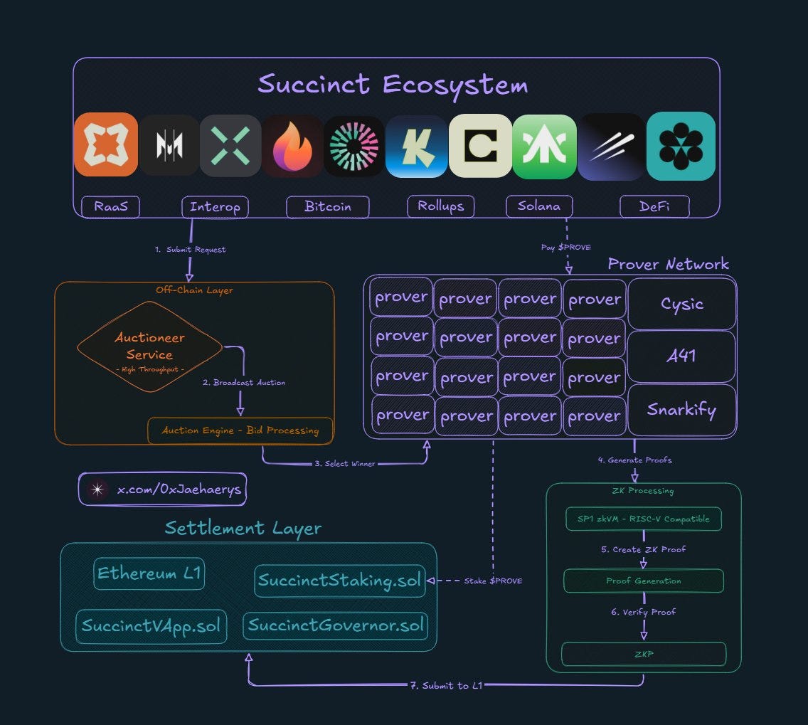 jaehaerys:Succinct Prover Network 是一个部署在以太坊上的去中心化 ZK 证明市场,旨在连接需要零知识证明的请求方(如 Rollup、桥、AI 应用)与全球算力提供者网络(Prover)。其架构采用 vApp 模式,将高性能的链下执行与链上结算相结合,由链下拍卖服务(Auctioneer)实时处理请求匹配与任务分发,链上智能合约(SuccinctVApp.sol、SuccinctStaking.sol、SuccinctGovernor.sol)则保障用户资金安全与最终结算的可信度。此外,整个网络以 $PROVE 作为核心经济驱动力,该代币不仅承担支付功能,也作为质押资产用于网络安全及治理用途。Prover 需质押 $PROVE 才有资格参与拍卖并执行任务,行为不当则可能被惩罚削减质押。与此同时,$PROVE 还支持委托机制,普通用户可将代币委托给指定 Prover 以获取部分收益。通过这种双重设计,Succinct 实现了 Web2 级别的性能与 Web3 的安全保障,并凭借预先整合的大量 Web3 合作方需求,确保了市场冷启动问题得以解决。