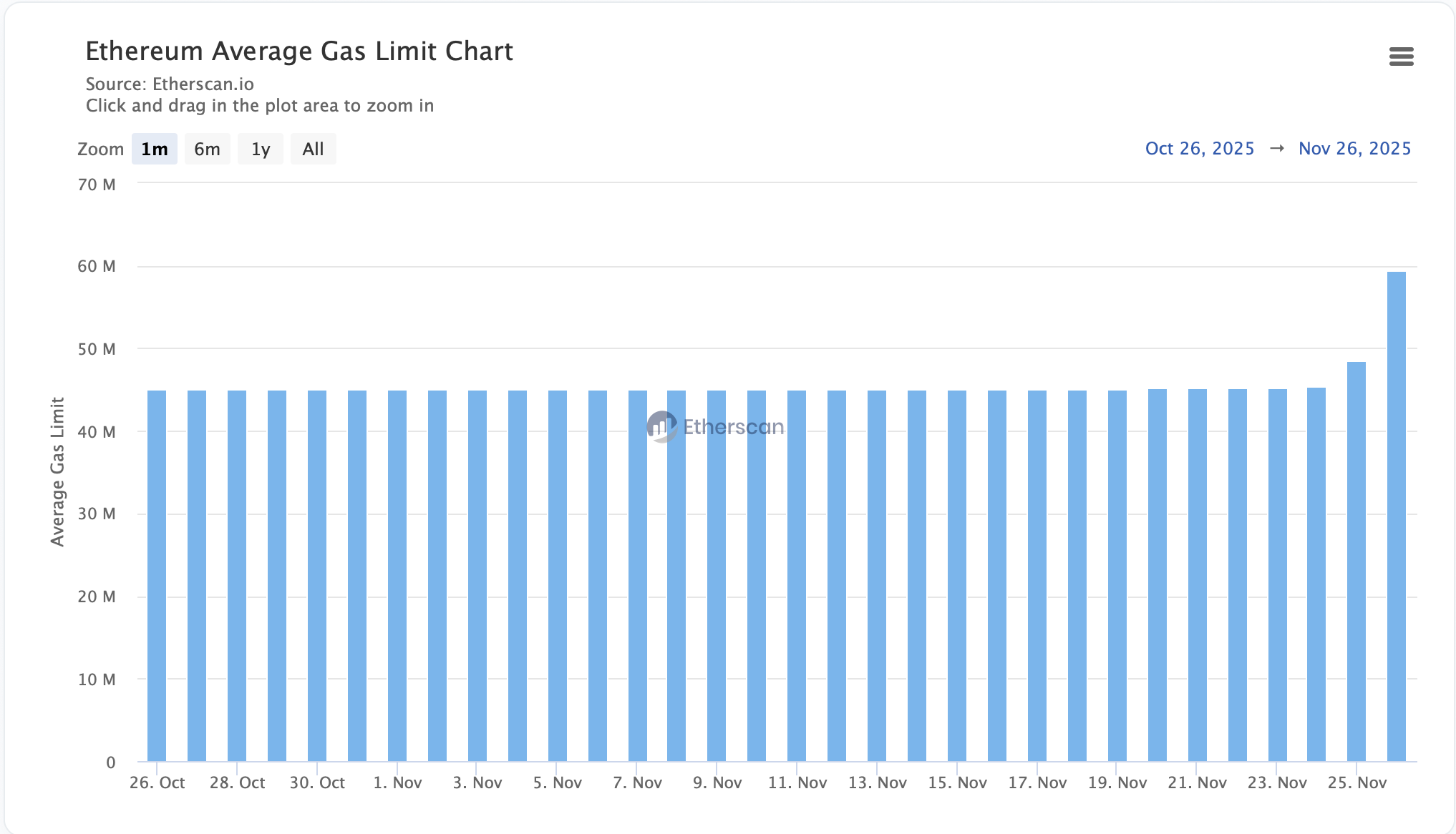 过去一年中,以太坊区块的 Gas 上限(Gas Limit) 从约 3000 万迅速提升到了 6000 万。这一飞跃背后有多重因素共同驱动,包括协议层对区块最坏情况大小的控制、执行客户端性能的大幅优化,以及针对更高 Gas 上限所进行的系统性测试验证 。