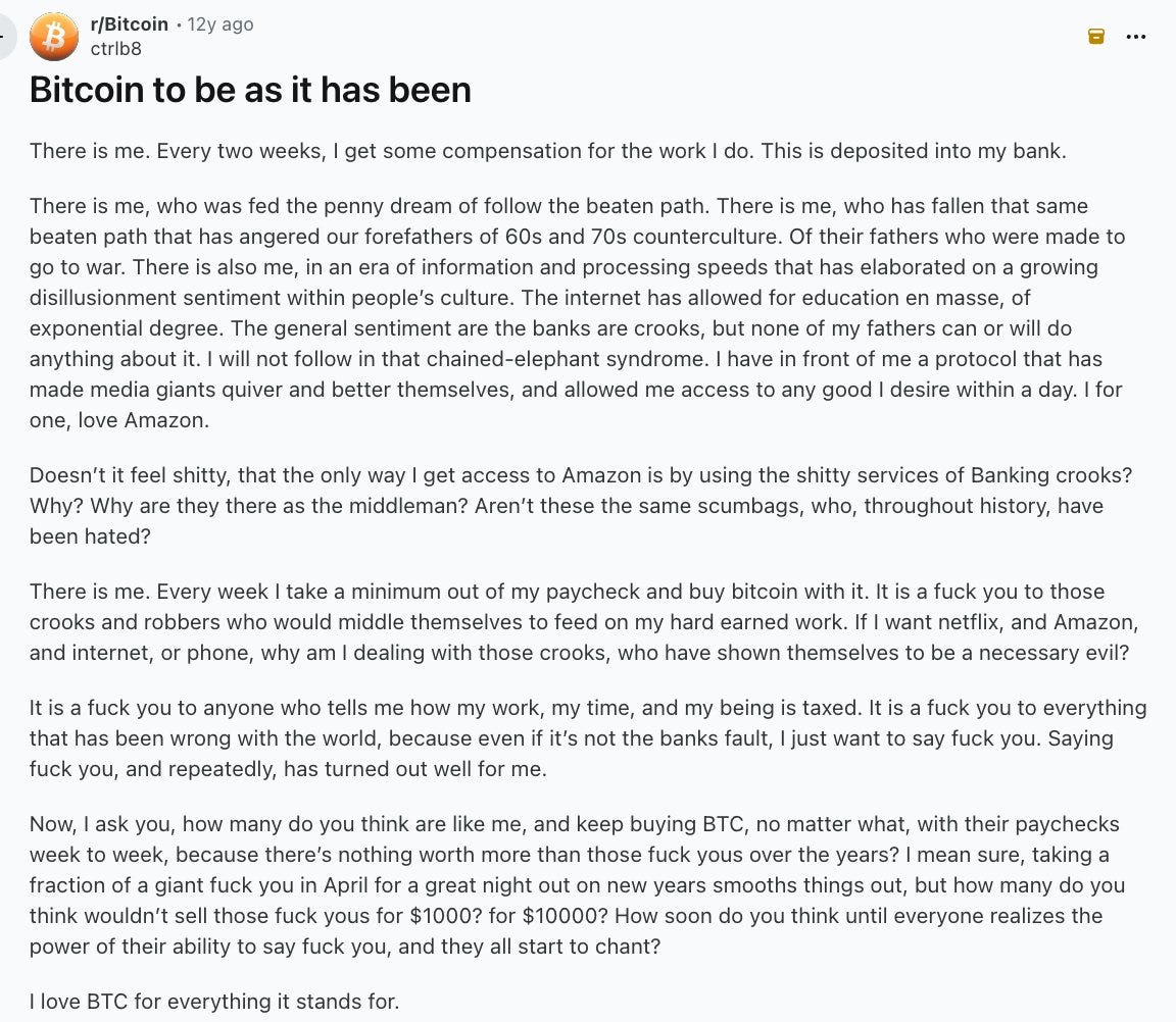 在早期,让某人进入比特币系统几乎像施展魔法。我们会让对方在手机上下载一个钱包,当第一笔比特币到帐时,你能看见对方的神情变化 —— 他们刚刚在无需许可、无需文书、无需监管的情况下开设了一个金融账户,并立即收到了价值。这是一记耳光,让人瞬间意识到传统银行系统的落后与压抑。在 Money 20/20 大会上,一位演讲者在巨屏上放了一个比特币二维码,当场进行实时抽奖,观众不断发送比特币,现场创建奖池。我身边的传统金融从业者说,演讲者可能已经违反了十几条法律,但没人关心 —— 这正是重点。那不仅是金融,更是反抗。Reddit 初期的热门贴子写得最直白:买比特币是因为这是对那些靠剥削我辛苦劳动的骗子和强盗的一个去你妈的。这种启动机制完美无瑕:你为事业奋斗、发帖、宣传、争论、拉人入场,直接提升了自己和朋友的钱包价值。由于比特币网络无法被关闭,每一次打压、每一次坏消息之后它都会继续增长。久而久之,人们开始相信魔法互联网货币本身就是目的,而不是权宜之计。