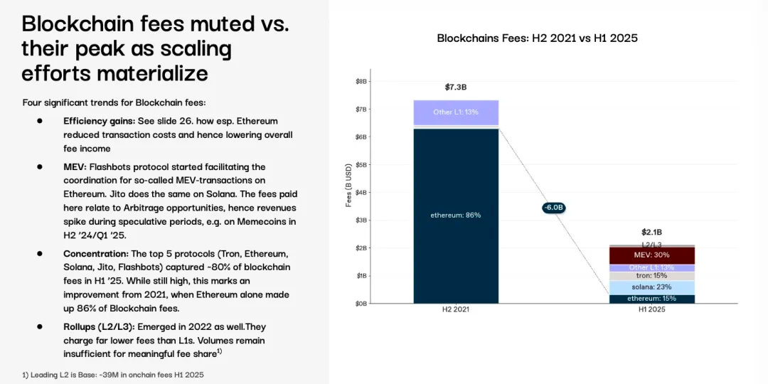 IOSG Ventures:在加密行业早期发展过程中,扩容和区块链不可能三角是长达数年的核心主题。以太坊等早期公链的吞吐量极为有限,区块空间一度成为稀缺资源。以 DeFi Summer 为例,由于链上活动的叠加,用户在 DEX 上进行一次简单交互往往需要支付 20–50 美元的 gas,极端情况下甚至高达数百美元。进入 NFT 周期后,扩容需求进一步达到顶峰。以太坊的可组合性虽然带来了生态繁荣,但也显著提高了单笔调用的复杂度与 gas 消耗,使得有限的区块容量主要被高价值交易占据。彼时,市场普遍将 L1 的手续费与燃烧机制视为其估值锚点,并形成「胖协议、瘦应用」的主流叙事 —— 大量价值将由底层基础设施捕获,推动了扩容赛道的技术热潮甚至泡沫。随着模块化架构的发展以及 EIP-4844 的正式实施,以太坊将 L2 数据可用性从昂贵的 calldata 迁移至更低成本的 blob,使主流 L2 的单位成本下降到几美分量级。Rollup-as-a-Service、定制化应用链以及支持不同虚拟机的 Alt-L1 激增,使区块空间从稀缺资产逐渐过渡为高度可替代的互联网商品。区块空间成本的长期下行,使得更多应用可以将核心逻辑直接上链,而无需复杂的链下架构。这一结构性变化促使价值捕获从以往聚焦底层基础设施,逐步向能直接承接用户流量、提升转化并形成稳定现金流闭环的应用与分发层迁移。