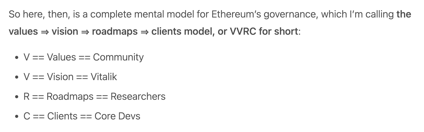 这里是以太坊治理的完整心智模型,我将其称为价值观⇒愿景⇒路线图⇒客户端模型,简称:VVRC。V == 价值观 == 社区;V == 愿景 == Vitalik;R == 路线图 == 研究人员;C == 客户端 == 核心开发人员。他们一起工作是这样的:社区围绕某些价值观聚集在一起;Vitalik 阐述了与这些价值观一致的愿景;研究人员根据愿景制定了路线图;核心开发人员根据路线图实施客户端。【原文为英文】( 来源 )