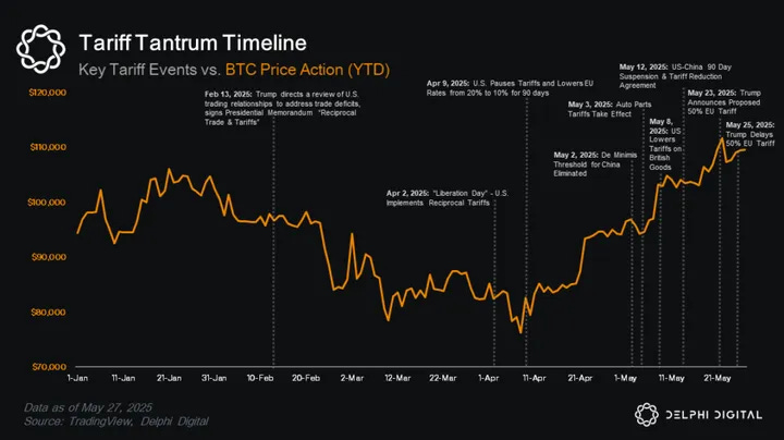 Delphi Digital:随着 2025 年 5 月即将结束,全球宏观经济环境依旧充满不确定性所笼罩。特朗普时期的关税政策引发了一系列贸易行动与报复,重塑了全球贸易格局,深刻影响金融市场,特别是比特币及更广泛的加密市场。此外,债券收益率上升、持续的通胀预期、美联储坚定的货币政策立场以及财政可持续性问题(如穆迪近期下调美国信用评级)共同构成了市场参与者面临的复杂背景。特朗普的关税风波自 2 月 13 日总统备忘录公布双边互惠关税政策开始,市场风险情绪在 4 月 2 日解放日之后达到顶峰,全球贸易战的风险变得触手可及。市场波动剧增,金融条件趋紧,风险偏好迅速枯竭,风险资产及流动性指标如比特币跌至年内低点。此前我们指出,年初市场面临最大阻力之一是几乎所有人都看好风险资产,过度乐观的美国关税政策成了引爆市场抛售的导火索,投资者措手不及,悲观情绪迅速攀升,4 月中旬市场进入恐慌模式。