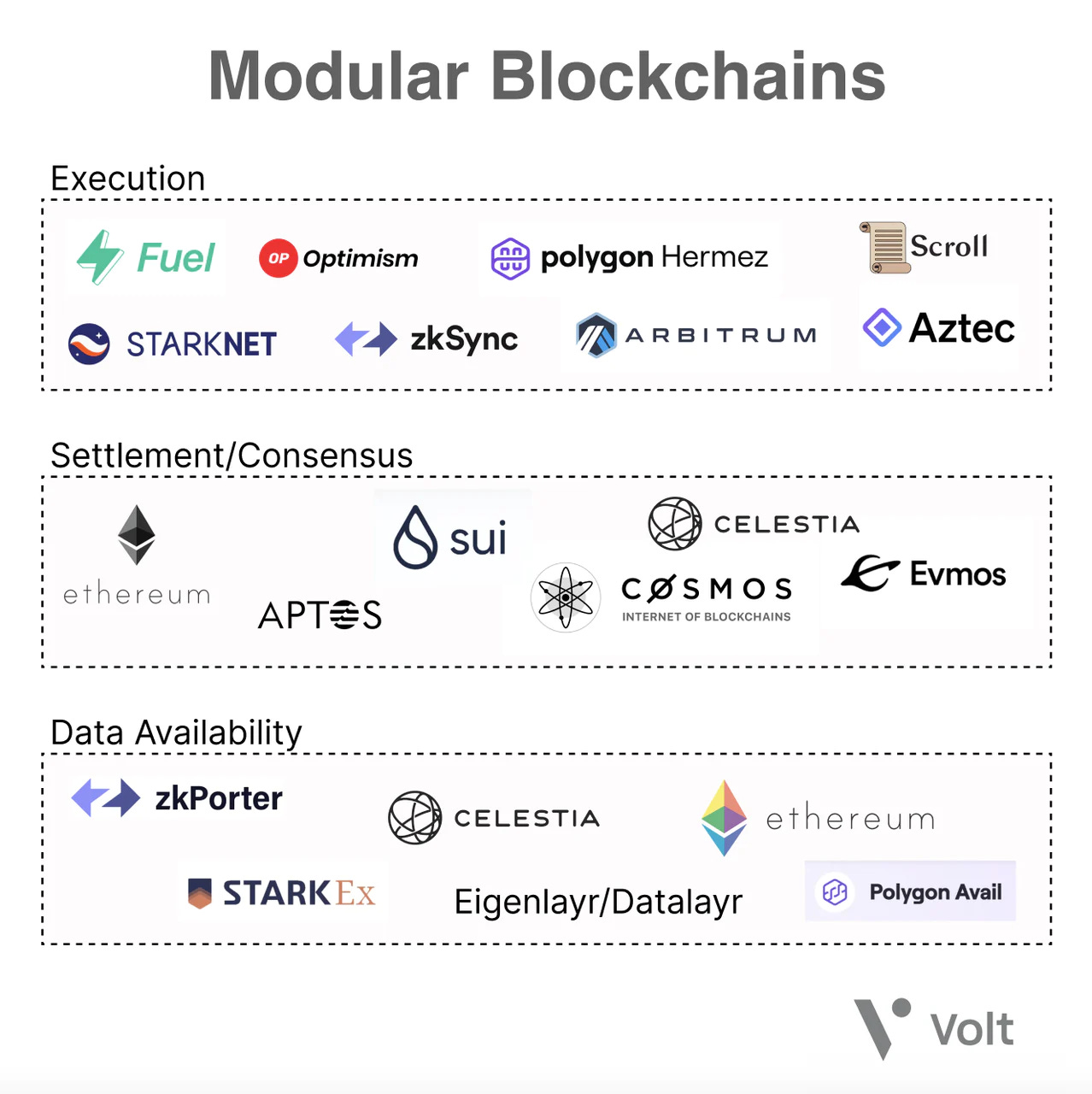 Karthik Senthil: 虽然模块化架构目前仍在起步阶段,但仍有一些令人兴奋的工具:1)数据可用性:Celestia 和 EigenDA 能够提供比以太坊快 10 至 20 倍的吞吐量;2)执行:分为通用 Rollup 或 L2(Optimism、Arbitrum、zkSync、Scroll、Polygon zkEVM、Starknet、Mantle)及自定义应用 Rollup (Optimism Bedrock、Arbitrum Orbit、Fuel、Eclipse、Caldera、Sovereign 等)两类;3)共识和结算:EigenLayer、Celestia 和 Cosmos Hub 为可信的中立基础设施或协议提供能力。【原文为英文】( 来源 )