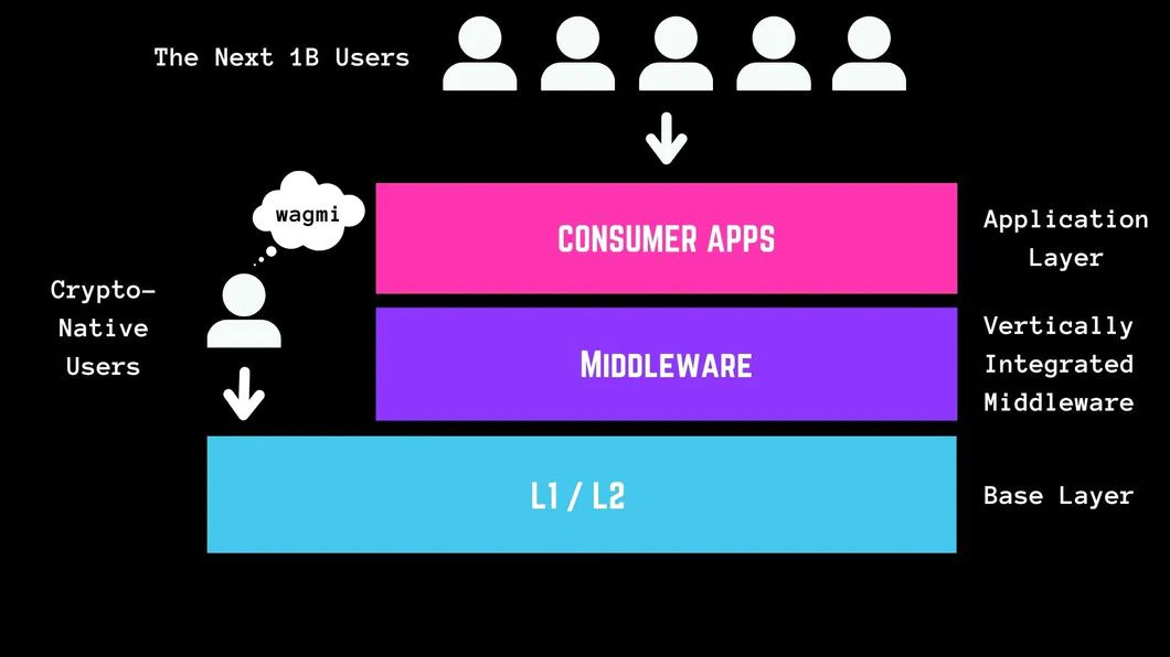 Karthik Senthil: 但我相信模块化设计最令人兴奋的领域是垂直整合的中间件。我们将其定义为「1)充分去中心化的网络、产品和服务,利用模块化设计在基础设施或协议层提供核心创新;2)从第一天开始就进行跨硬件、软件等原生设计,为特定用例提供质押及加密独有功能;3)应用开发人员能够在此基础上进行构建」。这种垂直整合的中间件解决方案看起来类似 Base 进化后裔。此外,看起来可能会像一个应用链,具有引导性网络安全,使用稳定币作为其原始资产,无需 Gas,隐私第一,支持托管等。诸如此类的解决方案能够让应用开发人员构建强大的消费者支付体验。【原文为英文】( 来源 )