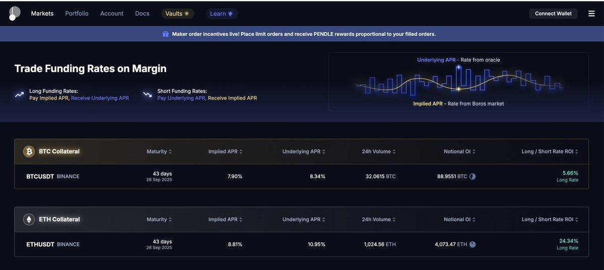 Boros 提供了一个针对资金费率波动的全新交易工具。它将某一底层资产在永续合约市场某期限内的资金费率收益抽象为「收益单位」(Yield Unit, YU),用户看多资金费率则买入 YU,看空则卖出 YU,并需缴纳抵押品。交易核心概念包括隐含年化费率(Implied APR)与实际年化费率(Underlying APR):做多 YU 相当于按买入时的 Implied APR 支付固定资金费率,换取按实时变动的 Underlying APR 产生的实际资金费;做空 YU 则反向操作。这样,Ethena 可在资金费率高位时,卖出与其空单仓位对应的 YU,从而锁定资金费收入。Boros 上线首日即录得 1500 万美元未平仓和 3600 万美元名义交易量,展现出市场需求。Pendle 团队预计,Boros 未来交易量有望达到现有旗舰产品 Pendle V2 的 10 倍,因为永续合约市场的成交量已是现货的 10 倍以上,而二者在市场结构上存在一定对应关系。这一机制不仅能服务 Ethena,也可为其他依赖资金费收益的协议提供对冲方案。