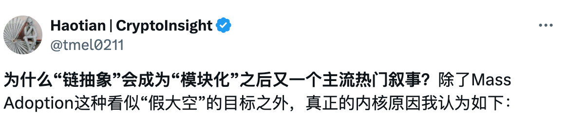 导读:为什么「链抽象」会成为「模块化」之后又一个主流热门叙事?加密研究员 Haotian 撰文分析除 Mass Adoption 之外的真正的内核原因。