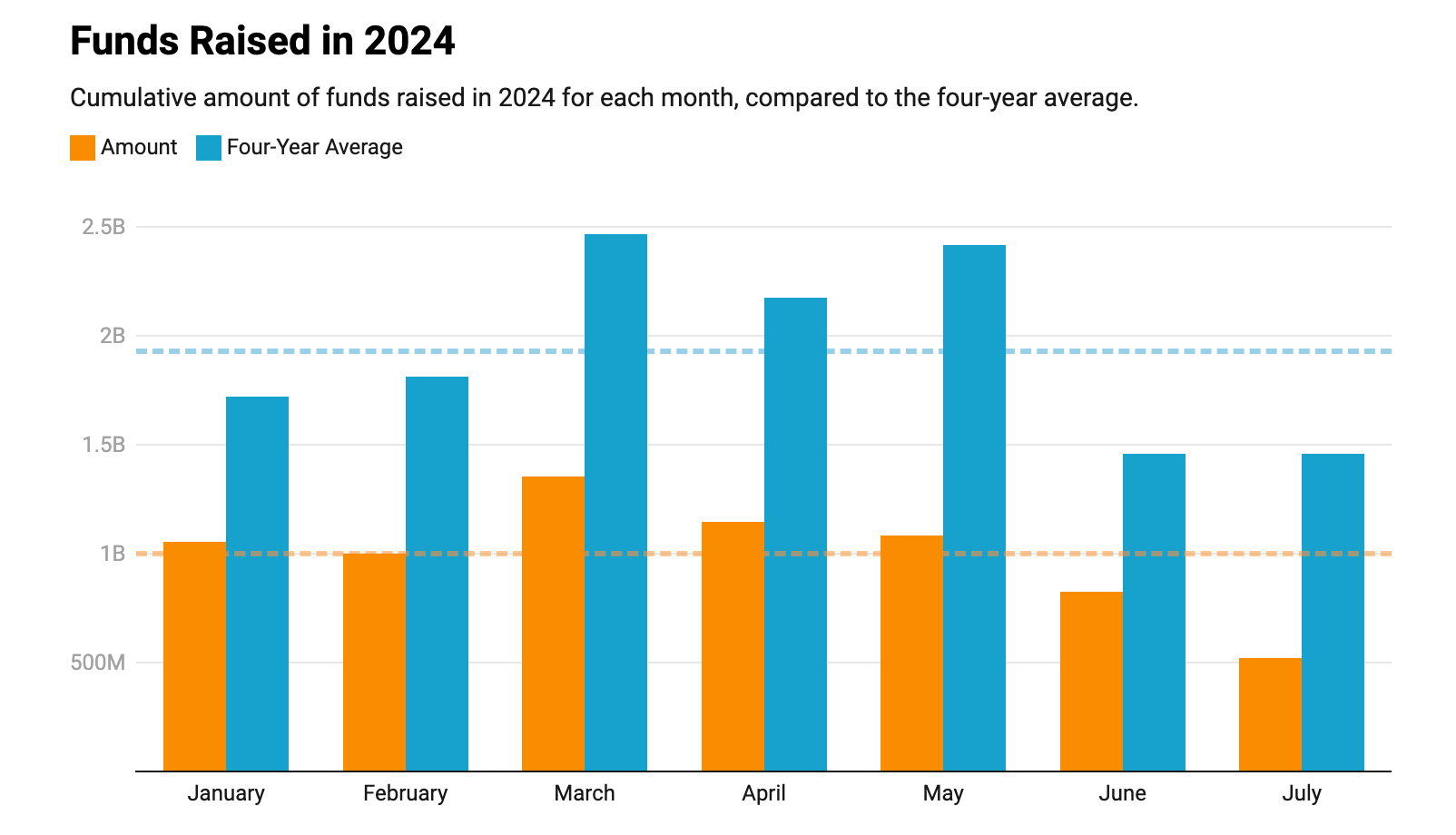 hyphin: 2024 年每月累计融资总额与四年平均融资总额相比相形见绌。这表明,随着我们向新常态过渡,获得大量初始启动资金的机会明显减少。然而,这并不意味活动已经平息。相反,已进行的融资轮次实际上高于平均水平。