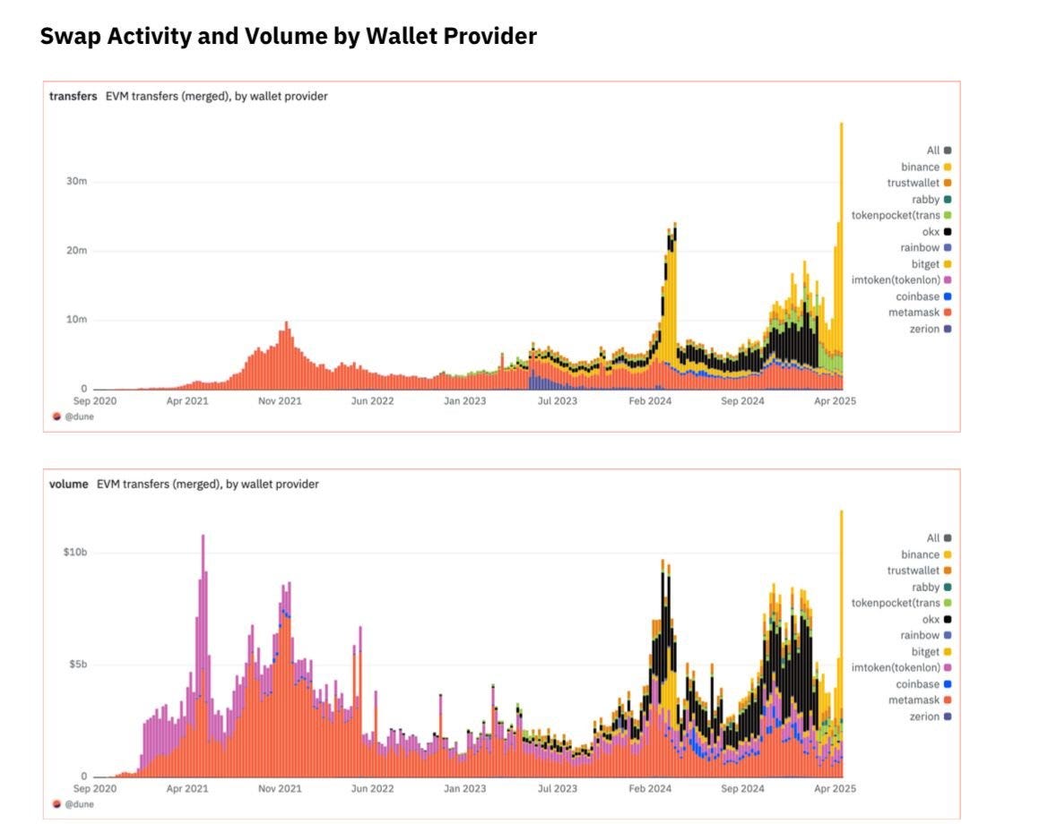 山寨币领域正在形成两极分化:一类是 PEPE、VIRTUAL 等轮动领导者,获得机构关注和实际成交;另一类则是 DINNER、Fartcoin 等投机彩票型,主要靠散户驱动。AAVE 因为治理驱动的回购行为,成为机构偏好的买入标的之一。与此同时,以 Base 和 Hyperliquid 为代表的二层网络正在悄然获得流动性增量,BNB Chain 上的交易数据也出现爆发式增长(虽然部分来自刷榜行为)。Solana 的币种生态则呈现出更碎片化特征,各类资产在吸引用户注意力方面分布更广。NFT 则成为被遗忘的战场,交易量平淡无奇,叙事也尚未找到新突破口,更多资金正在转向具备激励机制的 Meme 币生态。【原文为英文】( 来源 )
