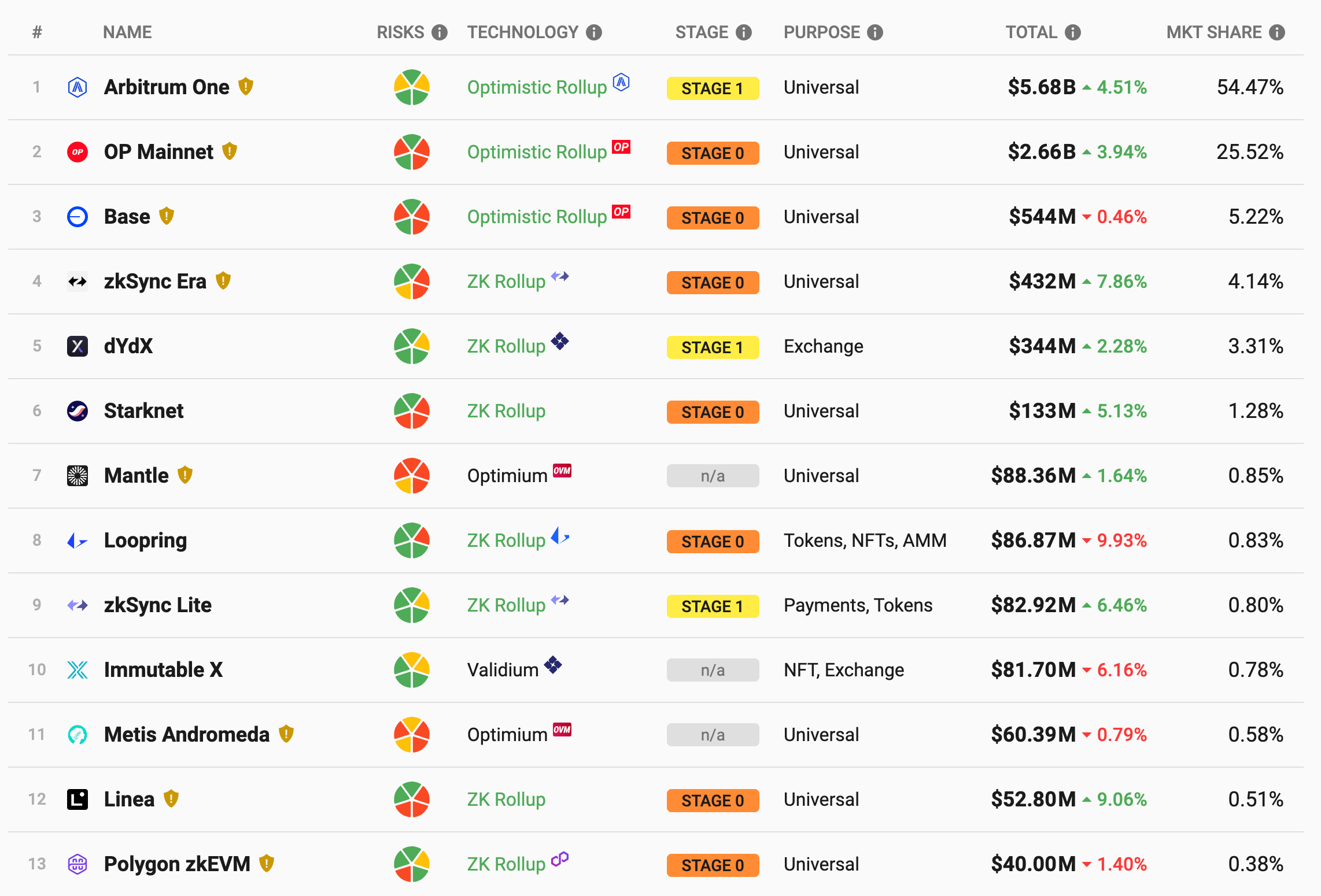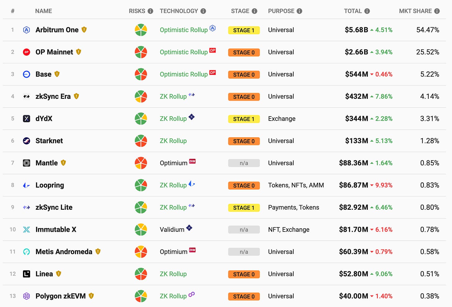 3)各 L2 数据,其中 TVL 涨跌幅为与 7 天前相比的变化,截止时间 9/19 22:00(来源:L2BEAT)