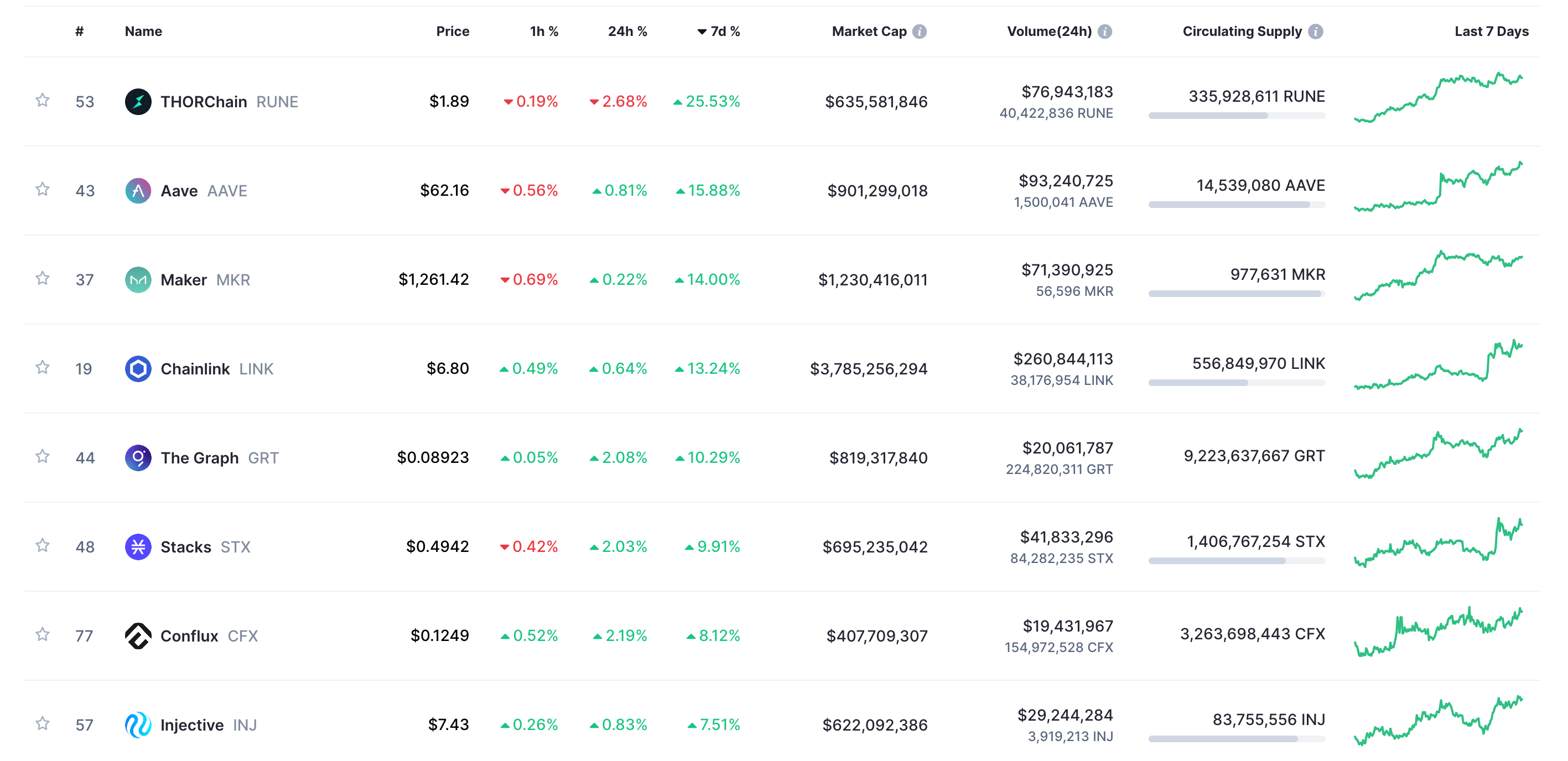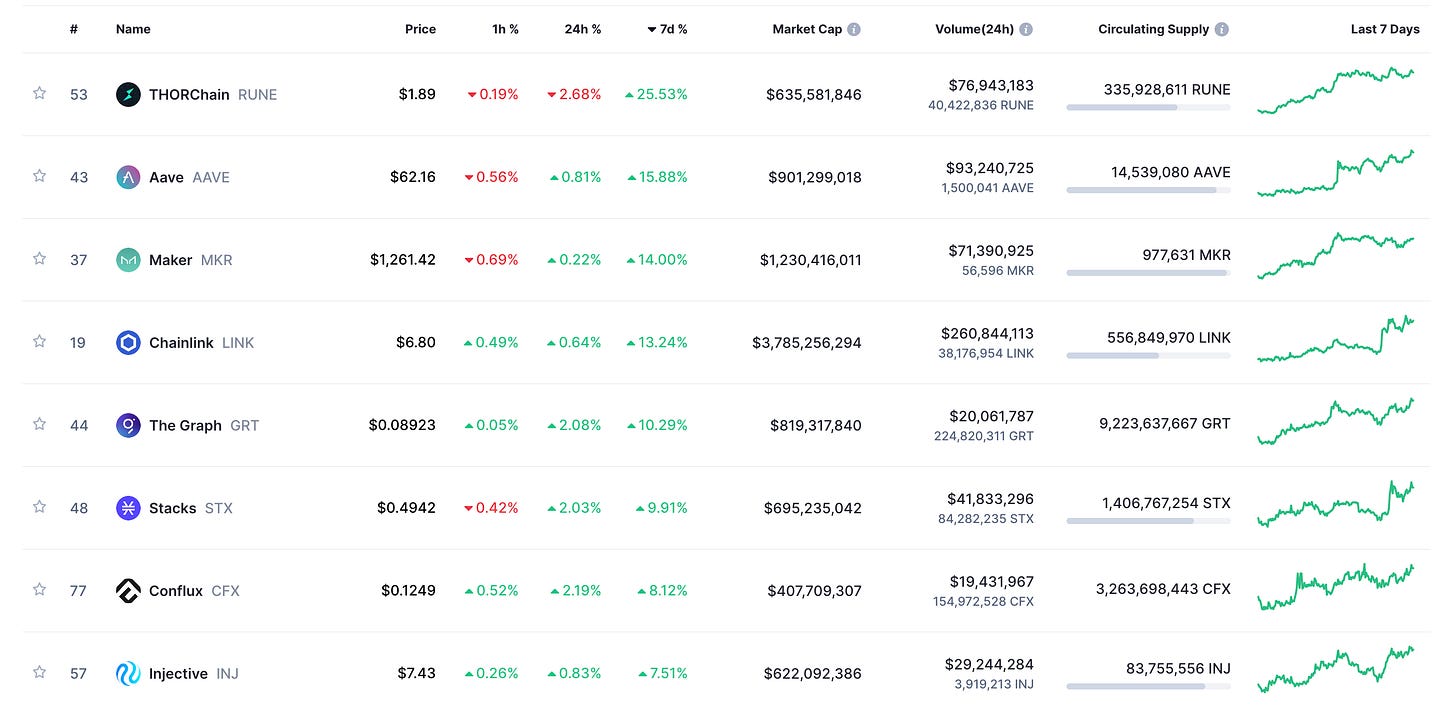 1)七天内涨幅最大的 DeFi 协议代币,截止时间 9/19 22:00(来源:CoinMarketCap)