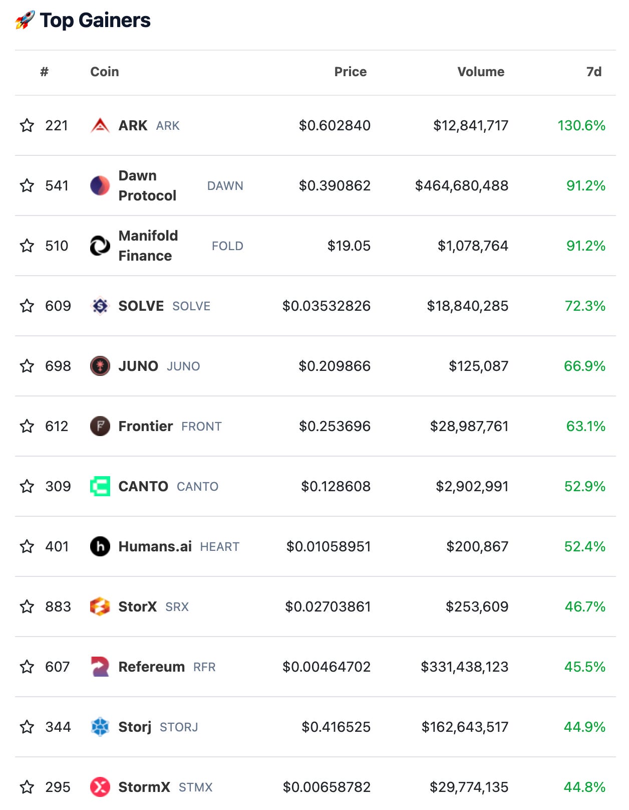 4)7 天内涨幅最大的代币,截止时间 9/19 22:00(来源:Coingecko)
