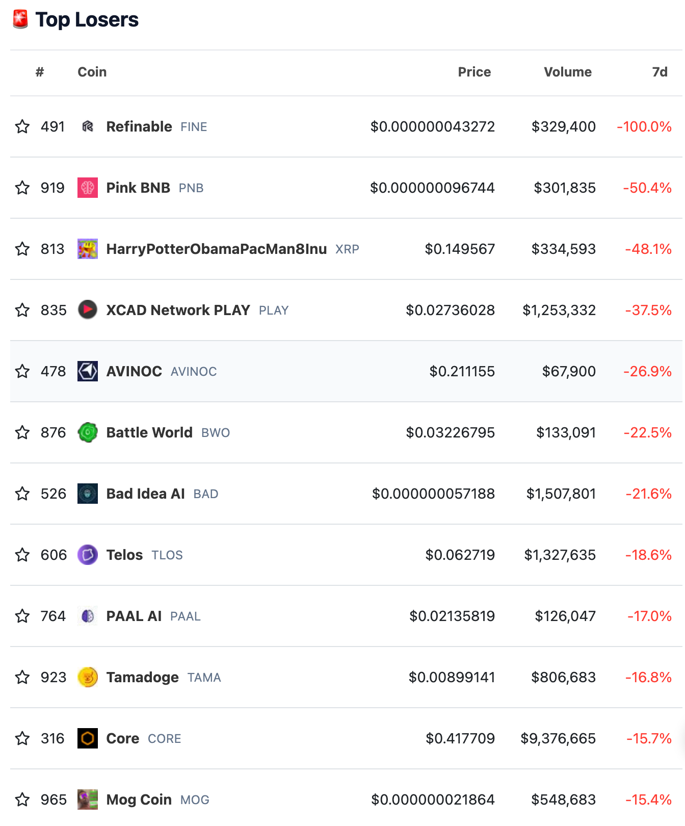 5)7天内跌幅最大的代币,截止时间 9/19 22:00(来源:Coingecko)