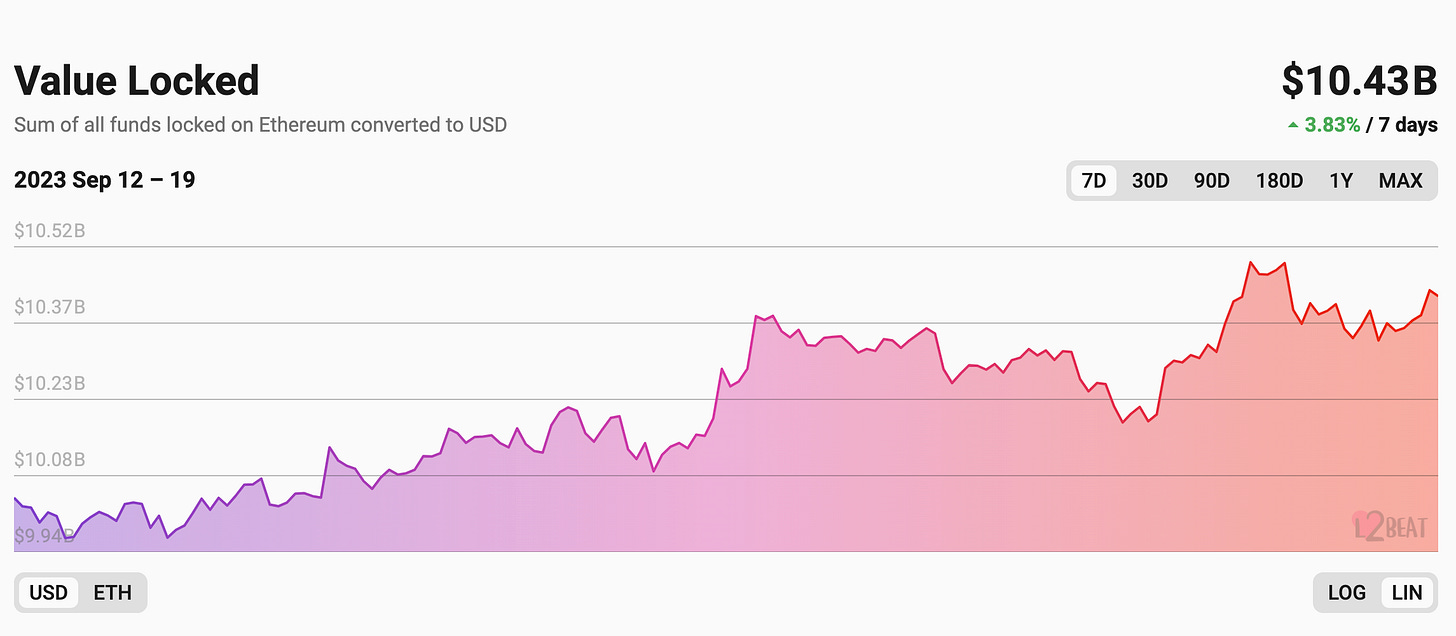 2)9.12-19 L2 总 TVL 较上一周变化:上涨 3.83% ,截止时间 9/19 22:00(来源:L2BEAT)