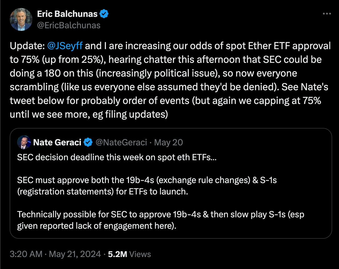此前市场对美国现货以太坊 ETF 能否获得批准持悲观态度,但昨日彭博社 ETF 分析师 Eric Balchunas 表示,其获批几率从 25% 提升至 75%,这一变化主要是由于该问题在大选年变得更加政治化。美 SEC 已经要求交易所加快更新 19b-4 申请文件,这表明他们可能在 5 月 23 日的关键截止日期前批准这些申请。此推文一出,以太坊应声暴涨,两天内触及高点 3800 美元。
