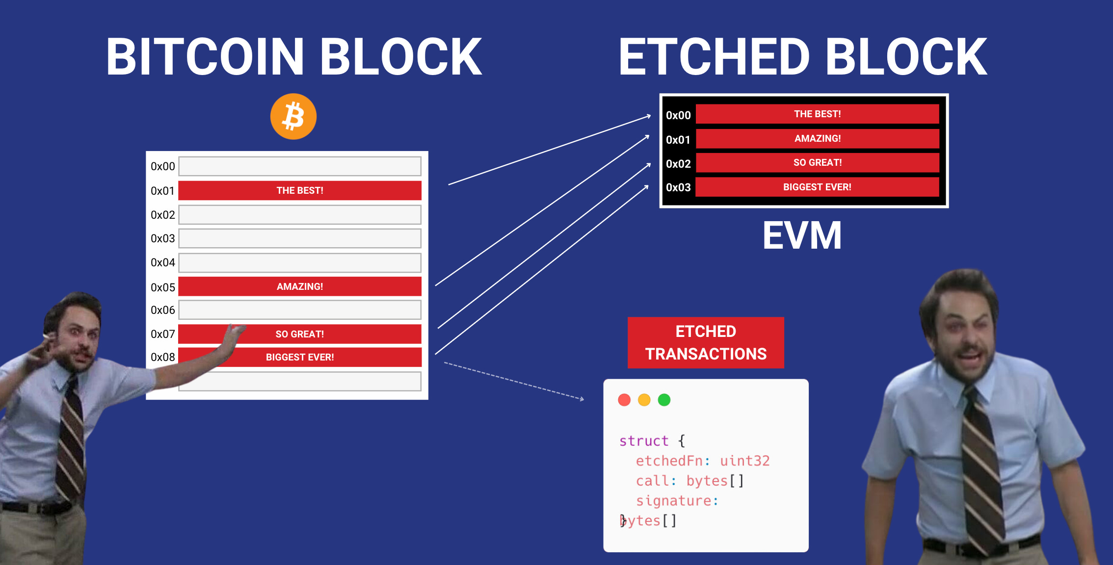 1️⃣ Etched Network:Based BTC EVM L2,允许用户通过直接在比特币区块链上处理交易来部署 EVM 智能合约并与之交互。Etched 不是 rollup,Etched 是 EVM L2。Etched 使用比特币的 POW 进行安全、排序和数据处理。Etched 是无信任的,没有中心化的部分。