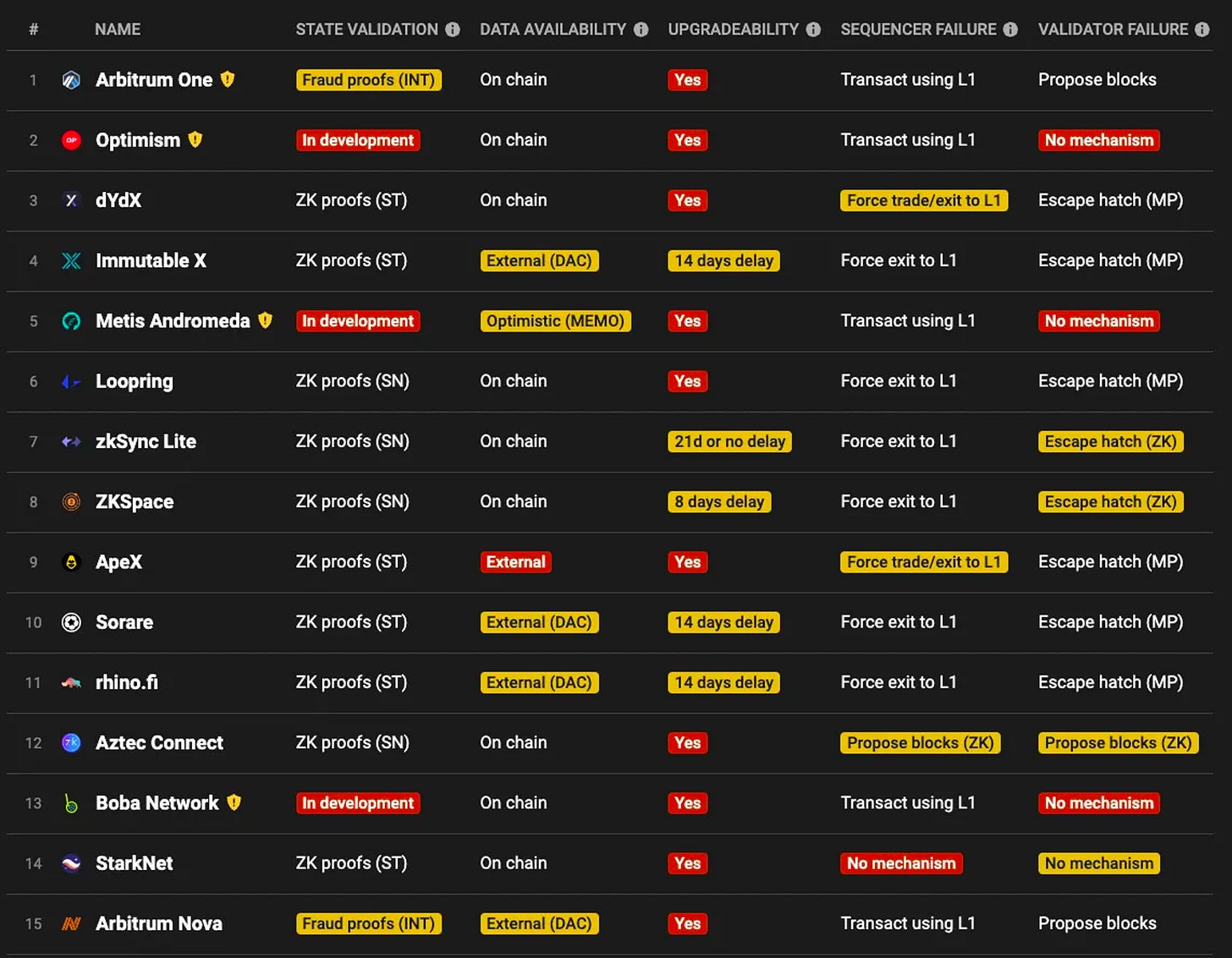 James Prestwich: 与侧链不同,Rollup 拥有与主链拥有相同的数据可用性保证,且与通道相比,任何人都可以在运行中加入 Rollup,而与分片而言,Rollup 是动态的。Fuel Rollup 是基于 UTXO 的,但是托管在一个基于账户的链上,Optimism 和 Arbitrum 虚拟机反映了 EVM 状态模型且被欺诈证明保护,Matter Labs 的 zkSync 使用其账户模型,每个状态更新都包括零知识有效性证明。【原文为英文】( 来源 )