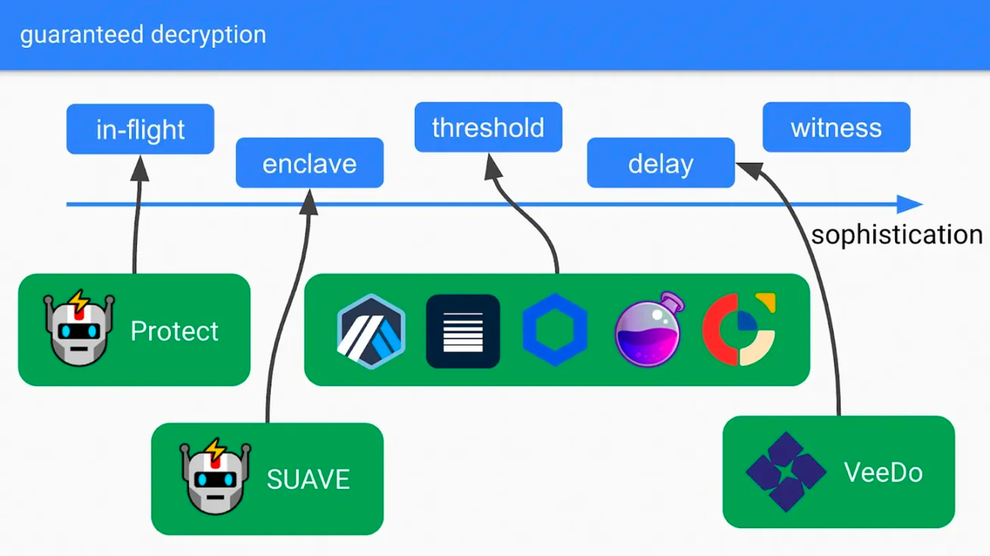 Jon Charbonneau: 保证解密不依赖于用户的方法:1)In-flight:向某个信任的第三方私下发送数据,该第三方可以对数据进行解密和查看,并承诺在数据提交到链上之前不会公开披露, 用例包括 Flashbots Protect 等;2)可信硬件:明文可以在受信任的硬件中运行,但在提交交易前不会公开解密,例如 Flashbots SUAVE 的 SGX;3)门限加密 / 解密(TED):一个委员会联合起来强制解密密文,但需要签名者达到一个门槛;( 来源 )