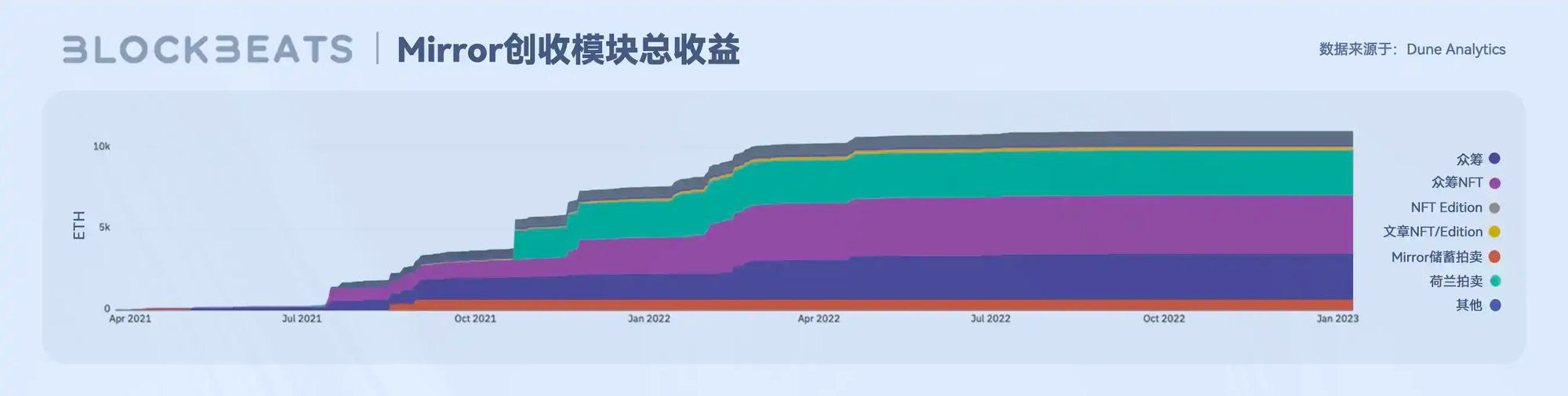 BlockBeats: 截至 2022 年底,Mirror 创收占比最大的两个模块是众筹和拍卖功能,写作 NFT 则仅有 210.43 ETH,占比 2%。写作 NFT 并没有为创作者带来可观收益,创收主体依旧是众筹事件。写作 NFT 功能遇冷的最大问题,在于所有权和社交属性的模糊设计。( 来源 )