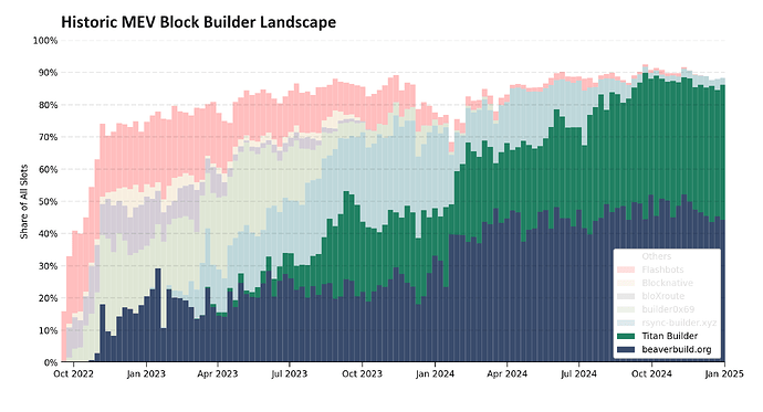 从表面上看,区块构建者似乎是在刻意隐瞒其区块价值,但从更务实的角度来看,当前系统的设计并未阻止这种行为。随着对拍卖机制的理解不断加深,构建者调整了竞价策略。这种信息损失,再加上私有交易池(private mempools)的增长,给智能订单流多路复用(intelligent order flow multiplexing)和 Gas 费估算带来了新的挑战。为了解决这些问题,BuilderNet 及其他团队正在开发新的解决方案,以优化 MEV 生态系统。