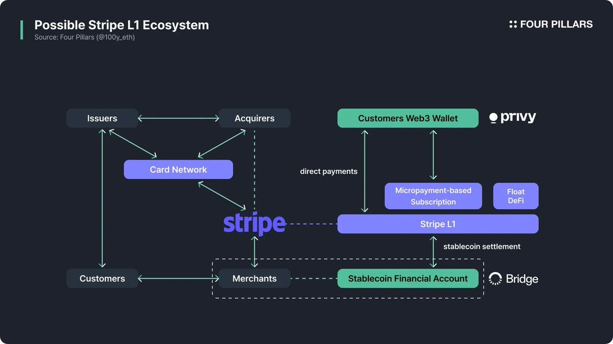 100y.eth💜 | a41:近期,加密社区流传着一个传闻:全球支付基础设施巨头 Stripe 可能将推出自己的 L1 区块链网络。这个传言的另一来源是 Paradigm 最近为一个被认为是 Stripe L1 的投资组合项目秘密招聘。不过,除了少数内部人士,没有人能确定 Stripe 是否真的会发布 L1。然而,考虑到美国主流金融圈对区块链和稳定币行业兴趣的快速上升,以及 Visa、Mastercard 等卡组织日益增加的区块链整合,再加上 Robinhood 宣布将通过 Arbitrum 代币化股票,这一系列背景足以让关于 Stripe 的猜测引发全行业关注。Stripe 一直致力于扩大互联网的 GDP,公司构建全球经济基础设施,帮助各类规模的企业进行支付、运营和增长管理。从这个角度看,区块链本身就是一种对 Stripe 极具吸引力的技术。事实上,Stripe 已经在积极扩展其区块链相关业务。今年 2 月,Stripe 斥资约 11 亿美元收购了稳定币基础设施公司 Bridge(@Stablecoin),战略性巩固其在稳定币金融基础设施领域的地位。紧接着,在 5 月的 Stripe Sessions 活动上,Stripe 正式发布了稳定币金融账户服务,向 101 个国家的企业开放,支持使用 Circle 发行的 USDC 和 Bridge 发行的 USDB 等稳定币,打通了与传统银行体系的无缝对接。