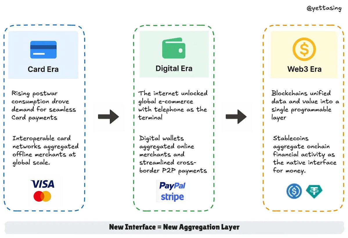 YettaS:真正的原生创新意味着在新的技术范式下才可能诞生的事物。在 Web3 世界中,长期以来人们一直在追问:什么才是真正属于加密栈的原生创新?正如 Fred Wilson 在 2009 年所提出的移动原生的定义:只有那些在移动设备出现后才可能存在的应用,才算是原生。以此类推,在区块链这一范式下,稳定币正逐渐显现出其作为 Web3 原生创新的代表性 —— 它重新定义了我们存钱、赚钱、借贷和消费的方式,成为加密经济中的核心金融界面。它不仅整合了信息与价值传递,将交易过程简化为一层架构,还带来了可验证(trustless)、开放接入(permissionless)和高度互操作性(interoperable)等特性。这种新的金融接口就像当年的信用卡与 PayPal 一样,为新一轮聚合与基础设施重构提供了可能。