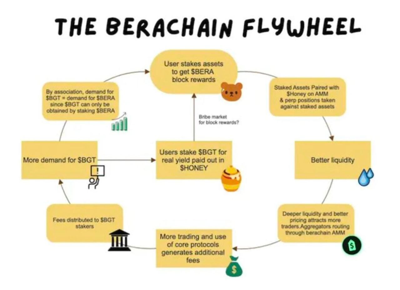 由于 BGT 代币不可转移的设计,链上用户的 Gas Token 是由 BGT 1:1 单向燃烧获得的 BERA,且借鉴了 Terra 原生稳定币的设计,用户可以透过 Honey Dapp 将 BGT 超额抵押印出原生稳定币 Honey。Berachain 还借鉴了 Canto 公有 Defi 基建的概念,将推出原生 DEX、原生借贷以及原生链上永续合约平台。这些公链原生协议产生的收入都将分给 BGT 持有者,其原生 DEX 还借鉴了 Solidly ve33 投票贿赂决定池子排放的机制,节点验证者将能够透过投票决定原生 DEX LP 池的代币激励排放,并得到贿赂奖励。这一套组合拳将有望让 Berachain 产生飞轮效应,吸引更多用户提供流动性来获得协议代币 BGT。