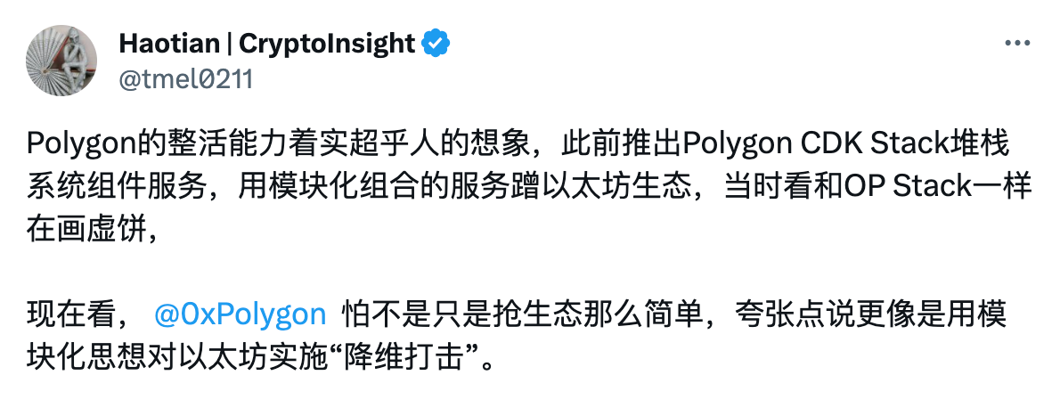 Haotian: Polygon 此前推出 Polygon CDK Stack 堆栈系统组件服务,用模块化组合的服务蹭以太坊生态。现在看,Polygon 怕不只是抢生态那么简单,夸张点说更像是用模块化思想对以太坊实施「降维打击」。CDK 提供一系列轻量化工具包服务,比如可选 zkEVM,可选 Sequencer,可选 DA,可选 Gas Token 等等,都做成高度灵活的组件工具包,供开发者选择。现在又要联合 NEAR 搞事情,Polygon 的可定制 Kit 工具和框架能大大降低开发者成本,Near 的分片技术和数据高效处理能力,甚至未来 Polygon 再把 Solana 的 VM 虚拟机给圈进来都有可能。