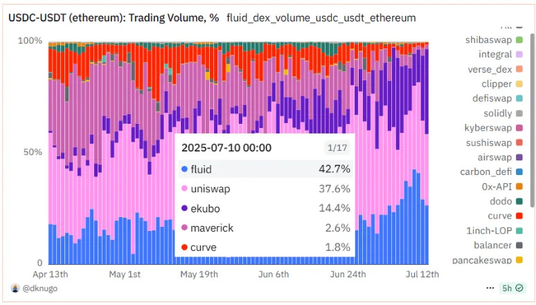 导读:Fluid 的实力已经开始显现 —— 在多个主流交易池中,协议持续从 Uniswap 手中抢占市场份额,表现强劲。