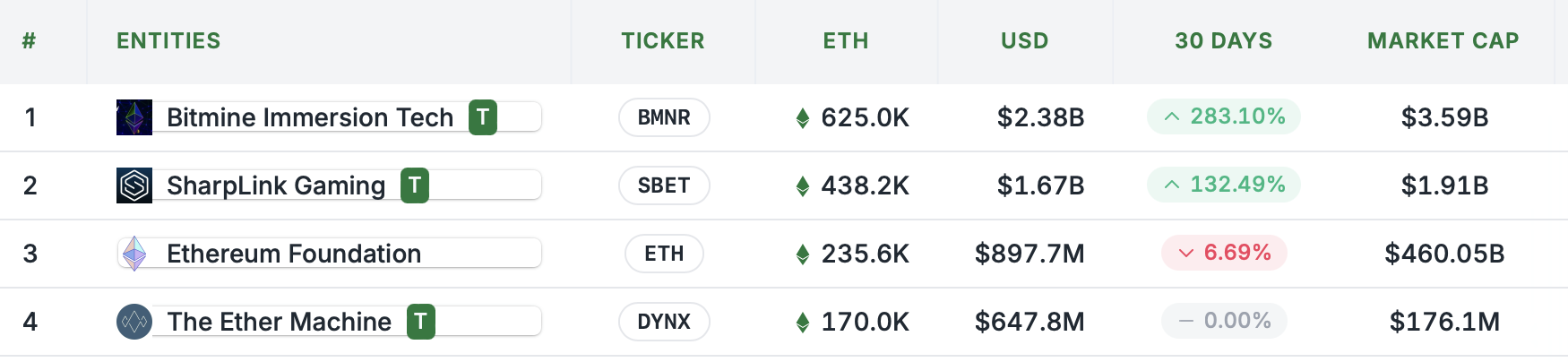 随着 2022 年以太坊成功完成从 PoW 到 PoS 的转型,Staking 成为新核心。Lido、EtherFi 等 Liquid Staking Token(LST)协议迅速崛起,占据 DeFi TVL 的半壁江山。Staking 锁仓虽减少了抛压,但也限制了 ETH 的流动性和经济活性。LST 相关应用(如循环贷)大量涌现,推动 AAVE、Morpho 等借贷平台 TVL 飙升。此阶段以太坊虽维稳,却缺乏新叙事,难以激发市场热情。3% 左右的年化利率虽吸引机构参与,但对价格的拉动作用有限。这使以太坊进入了又一轮价格低迷期。Gas 费用下降,链上活动乏力,市场陷入寒冬。与此同时,LST 与 DeFi 形成强绑定关系,反而限制了以太坊生态的叙事发展空间。直到 2024 年,美国批准现货 ETH ETF,ETH 正式进入主流资产行列。Bitmine 与 SharpLink 两家公司,仿效 Saylor 的微策略模式,通过买入 ETH、抵押再融资的方式不断放大头寸,带动市场 FOMO 情绪回暖。加之以太坊社区长年累积的商誉(V 神未曾站台空气项目,持续推动 ZK、隐私、简化方案等研发),ETH 再次获得机构青睐。( 来源)