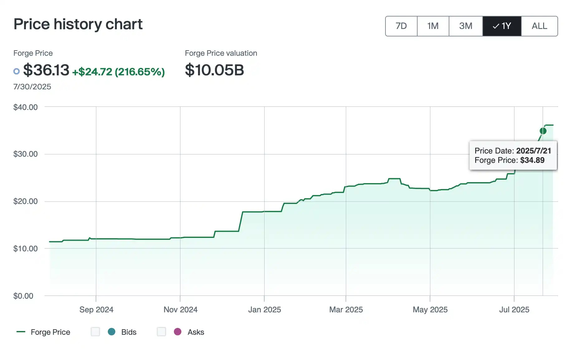 BlockBeats:随着 OpenAI、SpaceX 等顶级公司长期维持私有化,大量原始员工和早期投资者希望在上市前提前变现手中股权。而 Forge 正是连接这些想卖的人和想提前买的投资者的交易市场。如今 Kraken 的上市预期被炒热,若其员工或机构开始抛售股权,Forge 等私募股权交易平台可能成为散户押注的间接入口。在 Forge 平台上,投资者通常可以通过两种方式购买未上市公司的股份:第一种是直接交易,即你找到某位愿意出售 Kraken 股权的持有者,与之协商价格。Forge 会协助完成 KYC、尽调与合约签署流程。第二种是通过 SPV 交易(Forge Funds),Forge 会设立专门的特殊目的实体(SPV),汇集买家资金后统一购买目标公司股权。你所持有的是 SPV 的份额,而非公司股票本身。这种方式绕开 ROFR,更适合想快速入场的投资者,甚至可在几天内完成交易。等 Kraken 真正 IPO 后,SPV 也有望获得流动性兑现。目前 Forge 平台上的价格为 36.13 美元,一年内涨幅高达 200%,体现了市场对 Kraken 上市预期的热情。估值约为 100 亿美元,如果 Kraken 能够顺利以 150 亿美元估值上市,当前入场者或将获得超过 50% 的超额收益。