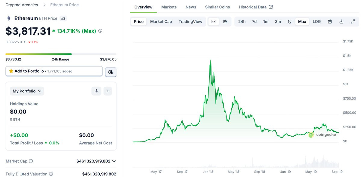 0xTodd:2015-2016 年,以太坊刚诞生时,仅凭智能合约这一项,就显得足够新颖。在当时,市面上的主流加密货币如比特币、莱特币、瑞波币等,均缺乏通用计算的能力。而以太坊提供了一个可以自由编写逻辑的合约平台,尽管彼时人们对它的应用还非常浅显,基本上只用来发币。彼时参与者甚至还在使用极其原始的钱包工具(如 MyEtherWallet),难以想象开发 DApp 的复杂程度。尽管如此,以太坊仍然因发币这一爆款功能迅速走红。ICO(首次代币发行)不再需要深度定制或技术团队,任何人都可以轻松部署智能合约,创造属于自己的 Token。由于参与 ICO 需要使用 ETH,市场形成了巨大的购买需求,推动以太坊价格一路上涨。2017 年 ICO 热潮达到巅峰,甚至在中国九四禁令后,以太坊价格由人民币 1400 元上涨到美元 1400 元。但随着太空链、英雄链等明星项目相继破发,市场泡沫开始破裂。大量项目方将募集来的 ETH 套现,投资者被套,FOMO 逐渐反转。以太坊从高点一路下跌,最终在 2019 年跌至 80 美元,跌入谷底。