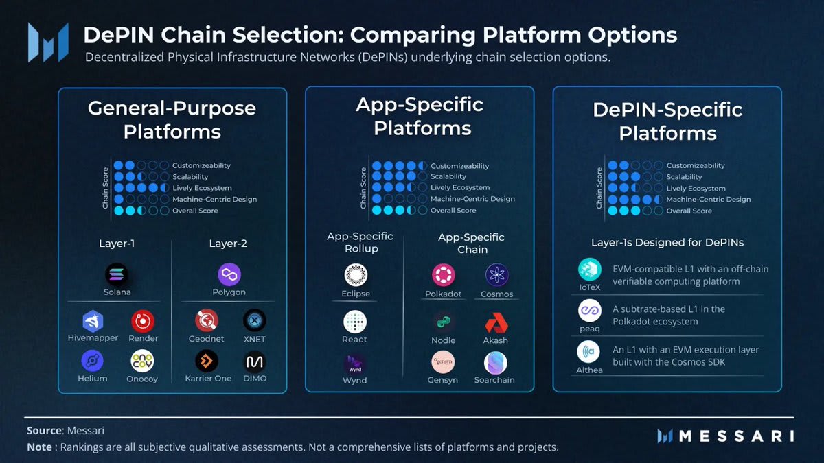 一些 DePIN 特定的平台还推出了基于硬件的网络。peaq 旨在成为 Polkadot 生态系统内的一个枢纽,提供以机器为中心的设计和创新的代币经济模型。Iotex 专注于物联网和机器经济,提供完整的 DePIN 解决方案。Althea Network 专注于去中心化的电信和基础设施所有权。【原文为英文】( 来源 )