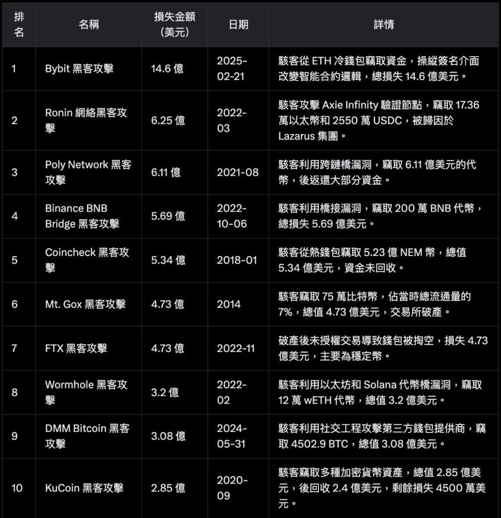 4️⃣ 十大加密货币黑客攻击排名与回顾