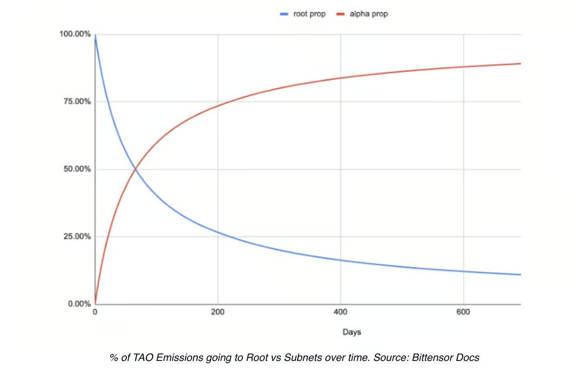 随着 dTAO 的上线,发行不再通过验证者权重来分配。而是通过一个市场驱动的系统,使用子网代币,也就是 Alpha 代币,来决定 TAO 的发行量。这些 Alpha 代币的价格反映了市场对一个子网的需求。需求越高,价格越高,表示子网越有价值。子网代币使用常数乘积自动化市场制造商(AMM)—— 与 Uniswap 使用的定价机制相同。任何时刻的价格由子网流动池中 TAO 储备与 Alpha 代币储备的比率决定。所以,不再是发行量由验证者任意分配,而是根据市场对子网的价值认知来决定子网的 TAO 发行量。