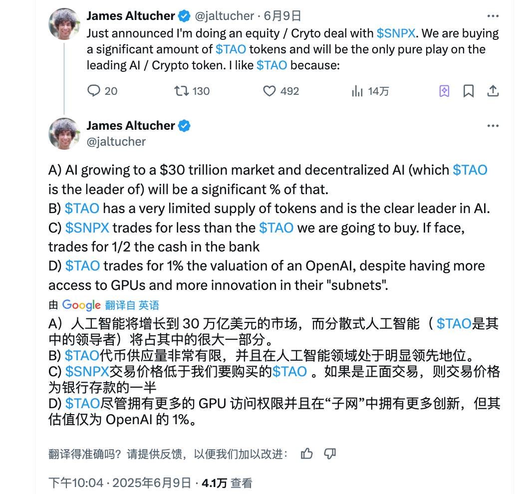 Synaptogenix(SNPX)是一家生物制药公司,专注开发治疗神经退行性疾病的布约他汀(Bryostatin-1)产品,市值约 500 万美元。6 月 9 日,公司宣布初始投入 1000 万美元购买 Bittensor 的 $TAO 代币,计划逐步增至 1 亿美元购买量。初期资金来自公司现金储备,未来拟通过 5.5 亿美元 Series D 可转换优先股私募补充,类似 MicroStrategy 的融资方式。私募吸引了知名投资人 James Altucher,他是著名企业家、投资者、畅销书作者,曾是对冲基金经理和加密早期支持者,主导代币购买策略,选择分阶段市场购买并筛选子网质押以优化收益。Altucher 通过人脉拉动私募资金,吸引机构关注 SNPX 的转型。公司转型源于药物临床数据未达预期,股价低迷,拟通过持有 TAO 和质押收益实现资产增值,甚至计划更名以强化 AI 代币定位。消息发布后,SNPX 股价一度上涨 40%。但 1000 万美元初始投资超过公司市值两倍,TAO 价格若跌破 300 美元,资产可能缩水 25% 以上,风险显著。5.5 亿美元私募成败大多依赖 Altucher 号召力和市场情绪。总体上,这是一场高风险高回报的翻身战。( 来源)