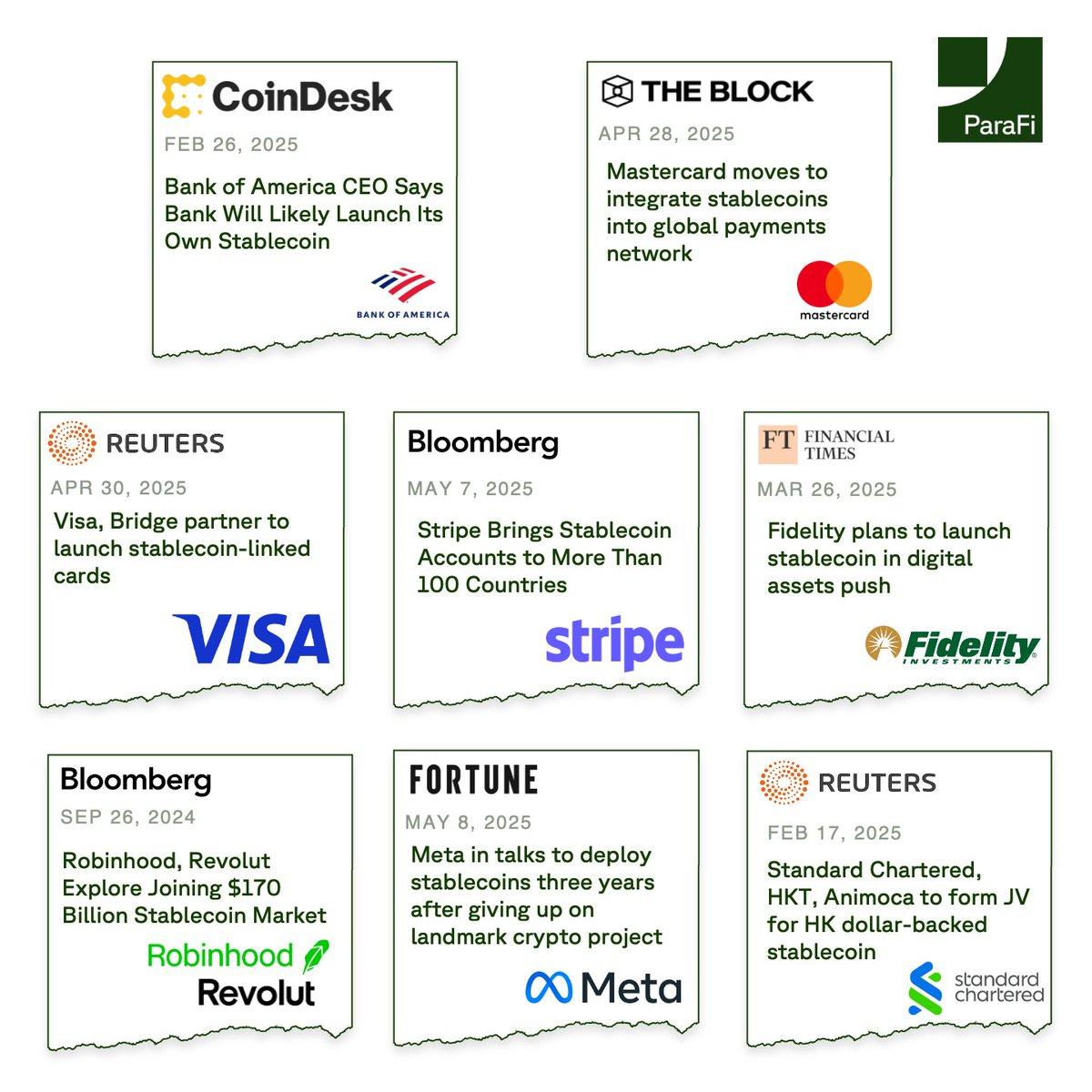 导读:稳定币已成为加密领域的杀手级应用,供应量激增至 2500 亿美元,推动关键立法的到来。这股势头引发了一场军备竞赛,推动包括 Visa、Stripe 和 PayPal 在内的银行、金融科技和支付巨头积极布局稳定币战略。