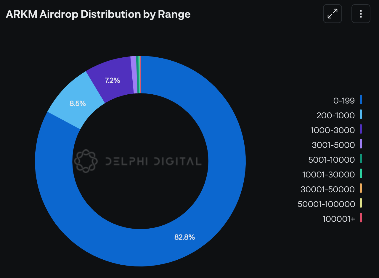 Priyansh Patel(Delphi Digital):从空投代币分布情况来看,获得 0 至 199 枚 ARKM 的用户占比为 82.8%,这一点并不令人意外。这与我们在此前 Uniswap 的空投中看到的情况非常一致。此外,95% 的 ARKM 代币接收者通过转移至中心化交易所或链上进行了出售。这种行为与此前的空投并不一致,至少在减持速度上不一致。