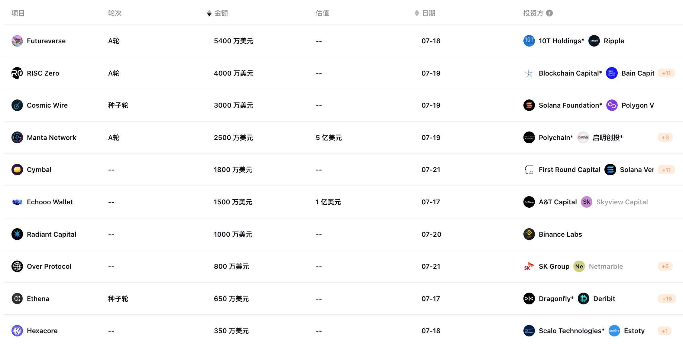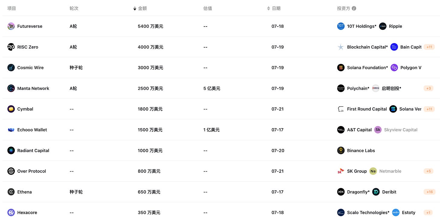 上周公开的融资事件共 20 起,融资金额超 2.18 亿美元(Futureverse/RISC Zero/Cosmic Wire/Manta Network/Cymbal/Echooo Wallet/Radiant Capital/Over Protocol/Ethena/Hexacore/Tromero/Side Protocol/Eyeball Games/Interface/MIDAO/dappOS/OpenEx/Web^n/Authic Labs/Bitsure)