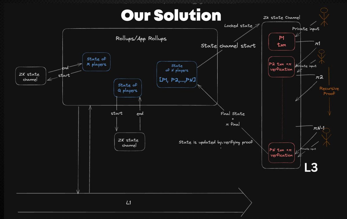 Rishabh Gupta: 除了横向扩展(如 RaaS、App chain 和 Micro Rollups)解决方案之外,我们还需要垂直扩展解决方案。但问题在于,如果我们有比特币中的状态通道或闪电等解决方案,我们如何信任执行。ZK 状态通道可以像 Ephernal L3 一样,在电路内部证明执行,状态通道在执行结束或游戏结束后结束。用户将其资产锁定在合约内,最终状态在执行完成后决定。【原文为英文】