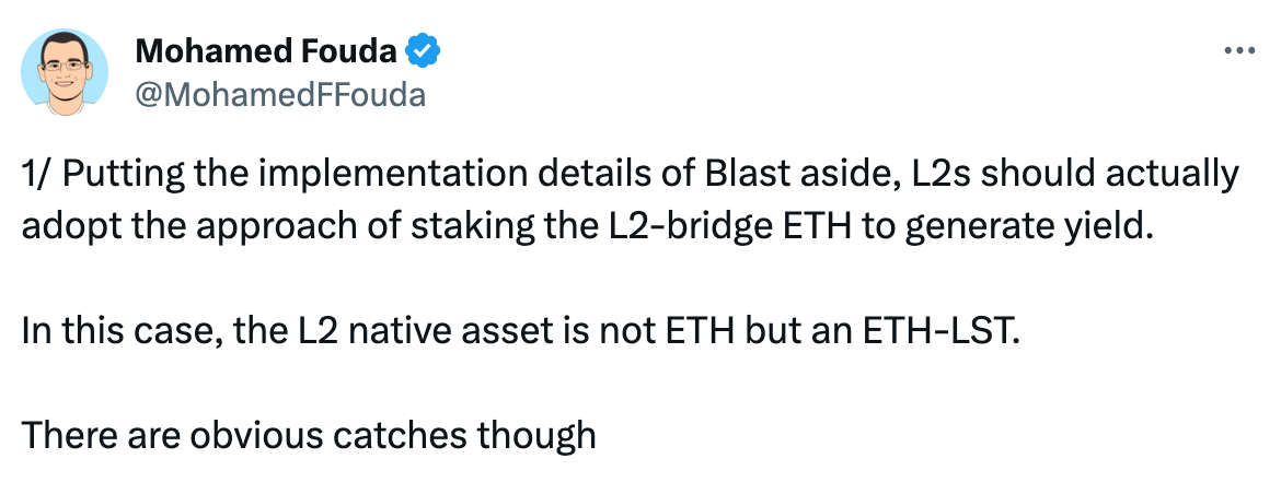 导读:针对 Blur 推出的自带收益的 Layer2 网络 Blast,Volt Capital 风险投资合伙人 Mohamed Fouda 认为抛开实施细节不谈,L2 应该采用质押 L2 跨链 ETH 的方法产生收益,在这种情况下,L2 原生资产不是 ETH,而是 ETH-LST。