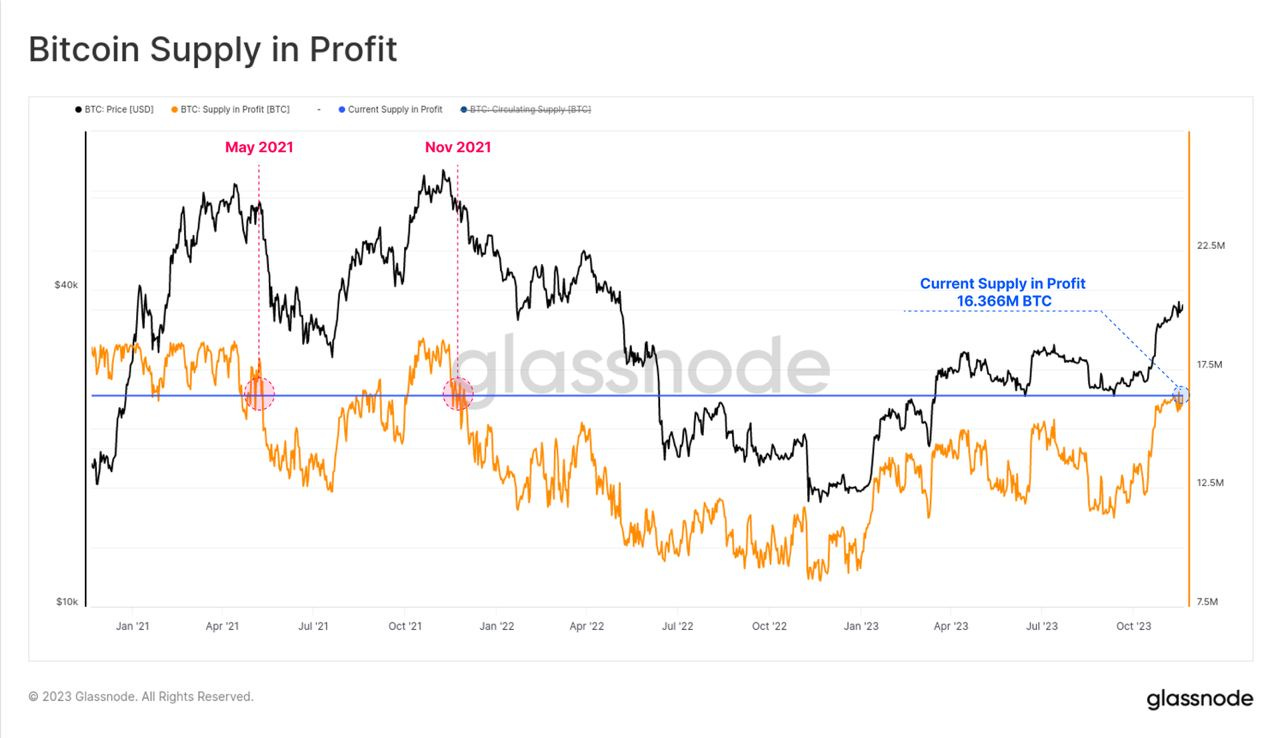导读:随着比特币交易价格接近年内高点,目前有超过 1636.6 万枚 BTC 处于盈利状态,相当于流通供应量的 83.6%。这使得代币利润量达到与 2021 年牛市高点相似的水平。Glassnode 撰文探讨这对投资者盈利能力意味着什么,以及它与过去牛市状况的比较。