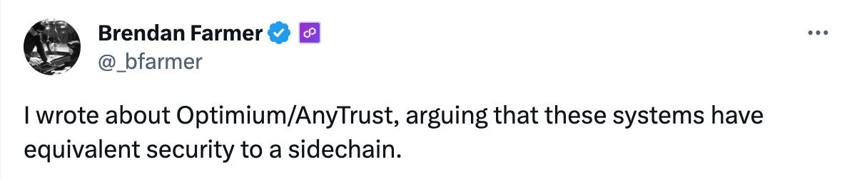 导读:Polygon 联创 Brendan Farmer 认为 Optimium/AnyTrust 的安全性与侧链相当,并撰文论证了 Optimium/AnyTrust 提供了与侧链相同的安全性和有效性保证。