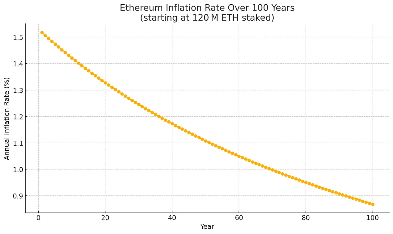 关于 ETH 作为价值储存资产的争论,核心在于其货币政策。不同于固定供应的比特币,ETH 采用自适应发行模型,其供应量与质押 ETH 数量动态关联。随着质押比例的提高,ETH 的发行速度并非线性增长,而是以质押总量的平方根为调节,形成了通胀率的软上限。即使所有 ETH 都被质押,年通胀率仍将缓慢下降,体现出高度的通胀控制能力。这种设计有效平衡了网络安全与通胀压力,赋予 ETH 稀缺性和适应性,进一步巩固了其作为主权数字资产的地位。通过这种机制,ETH 不仅是区块链网络的燃料,更是一个生产性资产,其价值通过保障、结算和驱动日益制度化的链上经济不断积累和释放。这一框架改变了传统的现金流和协议收入评估方法,促使市场以商品化视角重新认识 ETH,揭示了其作为未来数字经济核心储备资产的巨大潜力。( 来源)