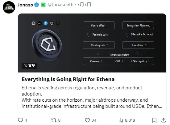 Jonaso:在不到一年的时间里,USDe 供应量从 0 上涨至 60 多亿美元,超越 DAI 成为第三大去中心化稳定币,仅次于 USDT 和 USDC。sUSDe 年化收益率已经达到 10%,成为当前加密领域最高可持续性收益。收益激增正推动 Aave 及其他去中心化平台上的激进循环套利策略发展。融资利率正不断上升,当前比特币融资利率为 19%,以太坊为 12%,这是 6 个月来两者首次同时突破 11% 基准线。Ethena 本周收入达 780 万美元,年化预期收入超 4 亿美元。保守估计仍有上升空间,当前 Ethena 已将 41% 的稳定币储备转入收益更高的永续合约策略,而市场平均资金费率已达到 14%。更高的年化收益率同时满足了启用 ENA 费用开关的关键条件:sUSDe 的收益必须比当前 Sky 储蓄利率(现为 4.5%)至少高出 5%,该里程碑现已确认达成。