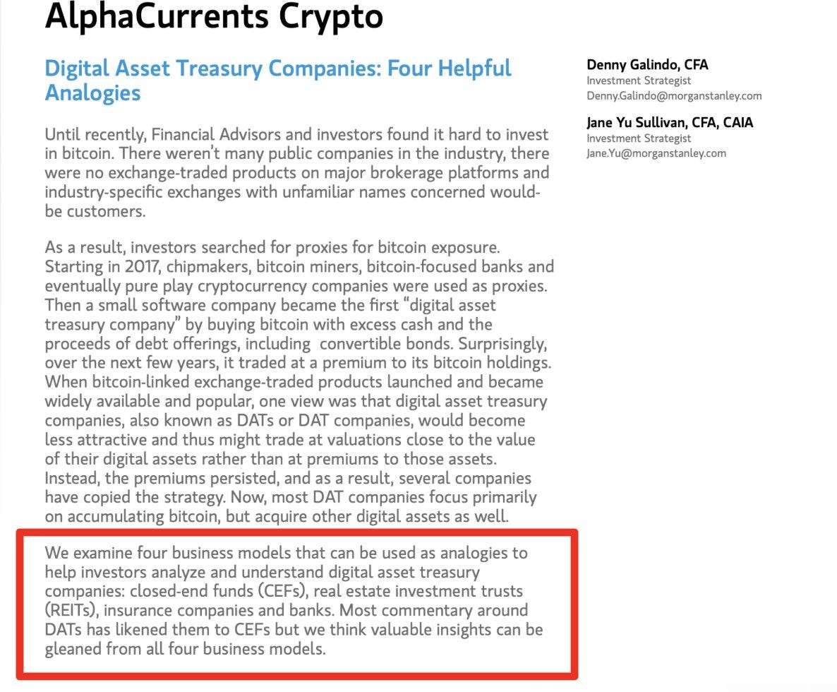 Mippo:首先,我依然觉得 DAT 这种结构大多是「愚蠢的」。不过,我越来越倾向于认为,加密行业中许多次优结构的存在,更多是过度监管所导致的结果。所以虽然我觉得 DAT 并不优秀,但我理解它们存在的原因,也认为它们还会存在一段时间。最近我读了一篇由摩根士丹利的 Denny Galindo 和 Jane Yu Sullivan 撰写的文章。他们指出,虽然大多数人把 DAT 拿来和封闭式基金(如 GBTC)比较,但其实也可以把它类比为 REITs(房地产信托基金)、保险公司甚至银行。对我来说,文章的核心观点是:像 REITs、保险公司和银行这样的投资载体有两类收入来源:金融工程 —— 通过市场波动率来获取收益;经营性收入 —— 来自实际业务运营的收益。这些企业都必须平衡资产和负债。银行、保险公司等需要确保账簿能够覆盖客户存款取出或保险赔付需求。因此,他们偏好流动性强、能产生收益的资产(比如国债)。