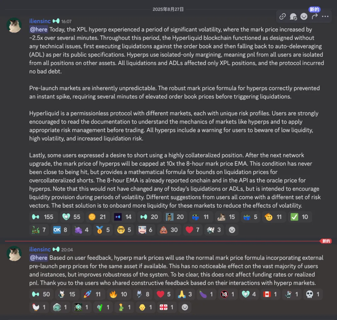 佐爷:2025 年 8 月 27 日,Hyperliquid(HL)盘前合约市场发生巨鲸狙击事件。据传与孙割相关的超级巨鲸地址大规模下单「攻击」$XPL 盘前合约市场,造成用户上千万美元损失。与 BTC/ETH 等主流市场不同,盘前合约成交量本就稀少,且规则允许无准许下单,使巨鲸有机可乘。事后 HL 团队在 Discord 回应称「深刻理解、坚决改进,但暂不赔偿」。这一处理引发争议,因为 HL 在不同安全事件中反应截然不同:2024 年 11 月,BitMEX 创始人 Arthur Hayes 曾批评其架构中心化;2025 年初,50 倍杠杆巨鲸爆破 HLP 金库后,HL 紧急下调多币种杠杆倍数;3 月 26 日面对 $JELLYJELLY 恶意狙击,团队直接拔网线干预。而这次 $XPL 事件未损及 HL 自身金库,官方却以「去中心化治理」回应。由此可见,HL 的治理逻辑仍在游走:若牵涉协议自身安全,则动用超管权限;若仅波及用户,则强调「风险自担」。这一矛盾再次凸显了 CLOB DEX 模式在中心化干预与去中心化承诺之间的灰色地带,也让人反思:所谓的「中立市场」,在关键时刻仍难摆脱人治。